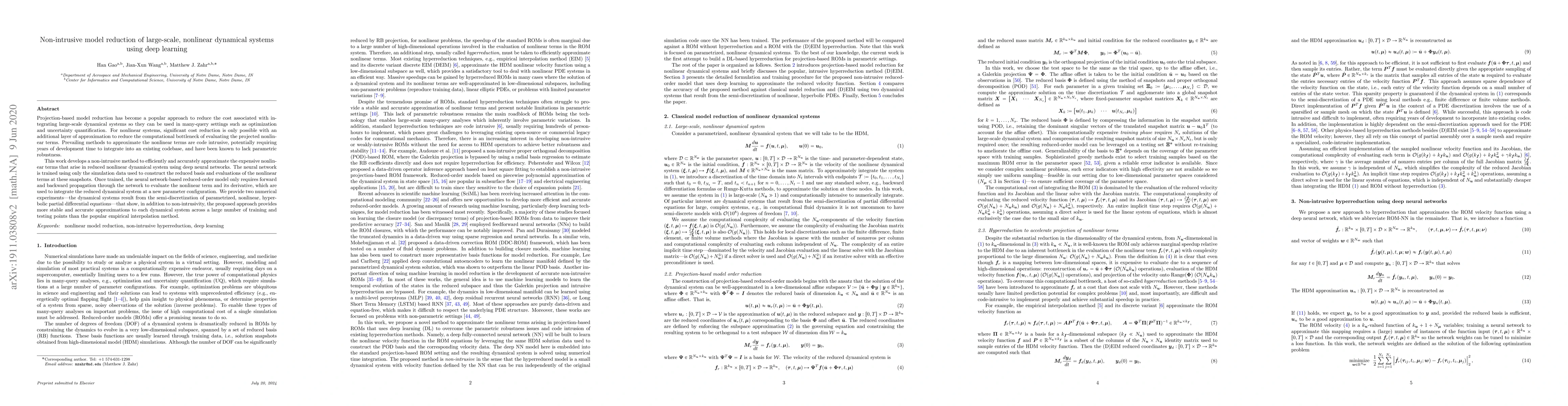 Projection-based model reduction has become a popular approach to reduce the cost associated with integrating large-scale dynamical systems so they can be used in many-query settings such as optimization and uncertainty quantification. For nonlinear systems, significant cost reduction is only possible with an additional layer of approximation to reduce the computational bottleneck of evaluating the projected nonlinear terms. Prevailing methods to approximate the nonlinear terms are code intrusive, potentially requiring years of development time to integrate into an existing codebase, and have been known to lack parametric robustness. This work develops a non-intrusive method to efficiently and accurately approximate the expensive nonlinear terms that arise in reduced nonlinear dynamical system using deep neural networks. The neural network is trained using only the simulation data used to construct the reduced basis and evaluations of the nonlinear terms at these snapshots. Once trained, the neural network-based reduced-order model only requires forward and backward propagation through the network to evaluate the nonlinear term and its derivative, which are used to integrate the reduced dynamical system at a new parameter configuration. We provide two numerical experiments---the dynamical systems result from the semi-discretization of parametrized, nonlinear, hyperbolic partial differential equations---that show, in addition to non-intrusivity, the proposed approach provides more stable and accurate approximations to each dynamical system across a large number of training and testing points than the popular empirical interpolation method.