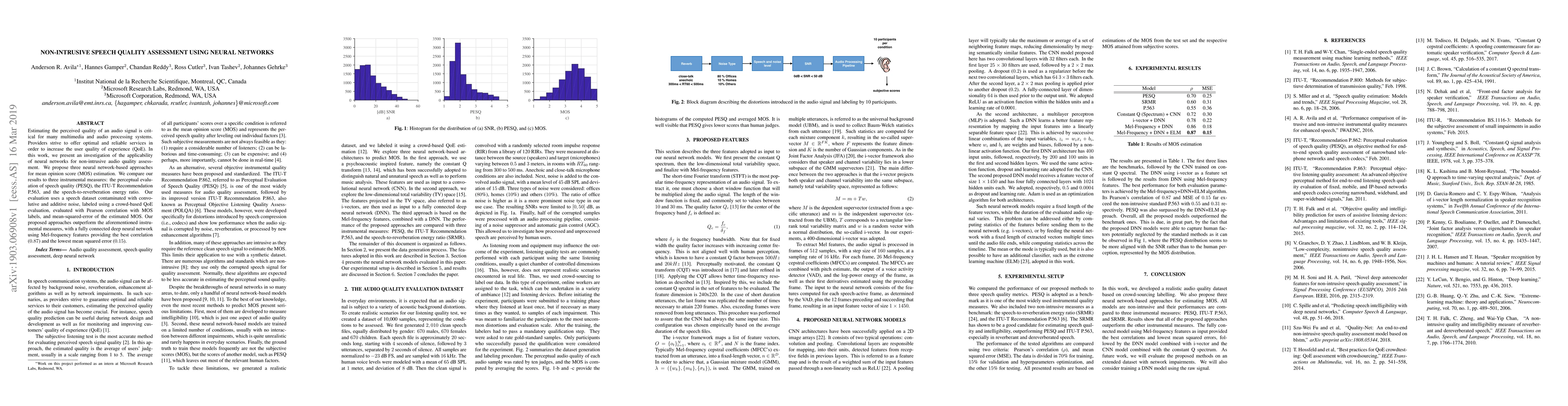 Estimating the perceived quality of an audio signal is critical for many multimedia and audio processing systems. Providers strive to offer optimal and reliable services in order to increase the user quality of experience (QoE). In this work, we present an investigation of the applicability of neural networks for non-intrusive audio quality assessment. We propose three neural network-based approaches for mean opinion score (MOS) estimation. We compare our results to three instrumental measures: the perceptual evaluation of speech quality (PESQ), the ITU-T Recommendation P.563, and the speech-to-reverberation energy ratio. Our evaluation uses a speech dataset contaminated with convolutive and additive noise, labeled using a crowd-based QoE evaluation, evaluated with Pearson correlation with MOS labels, and mean-squared-error of the estimated MOS. Our proposed approaches outperform the aforementioned instrumental measures, with a fully connected deep neural network using Mel-frequency features providing the best correlation (0.87) and the lowest mean squared error (0.15)