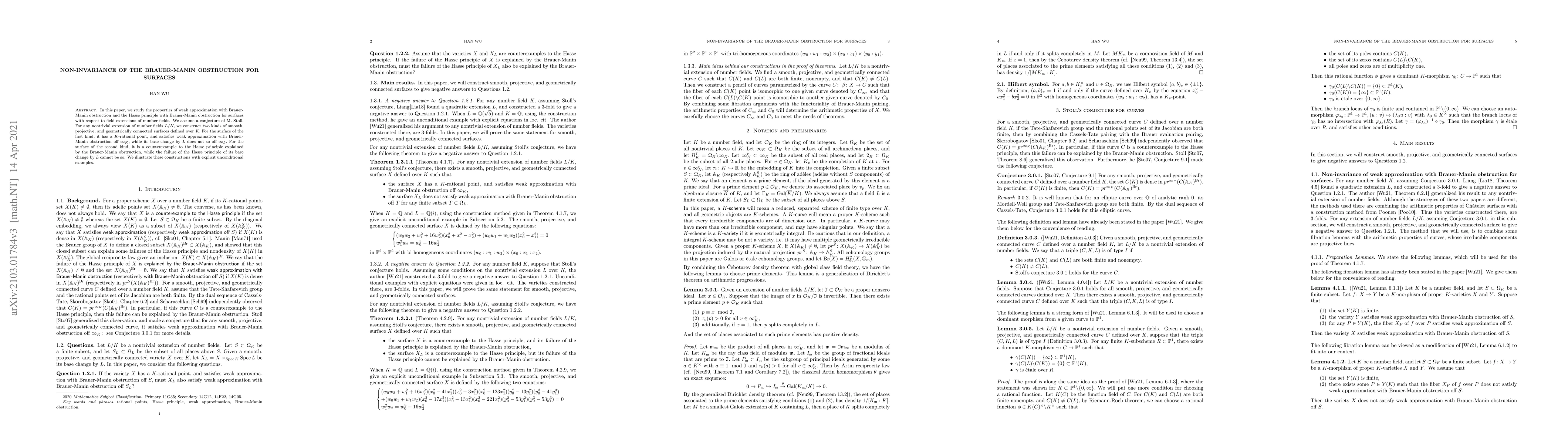 This paper investigates the behavior of weak approximation and the Hasse principle with Brauer-Manin obstruction for surfaces over number fields, demonstrating non-invariance under field extensions. It constructs two types of surfaces that serve as counterexamples, showing how the obstruction fails differently for base changes.