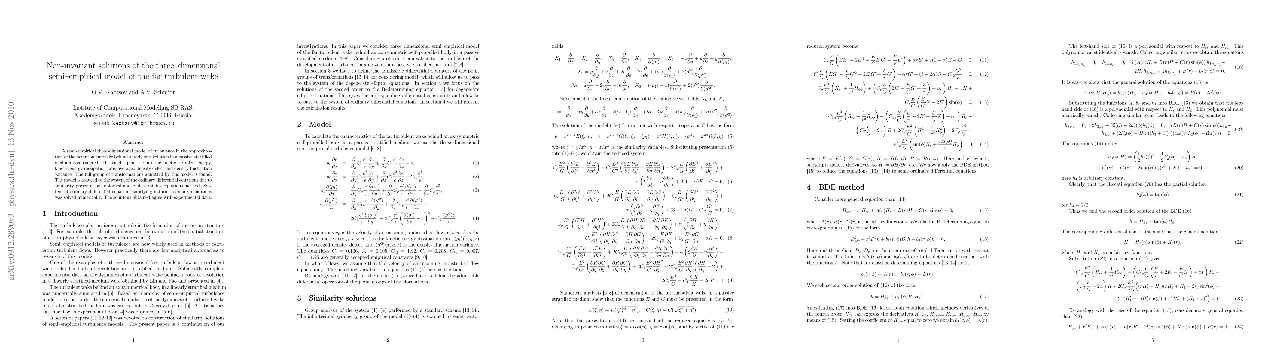 A semi-empirical three-dimensional model of turbulence in the approximation of the far turbulent wake behind a body of revolution in a passive stratified medium is considered. The sought quantities are the kinetic turbulent energy, kinetic energy dissipation rate, averaged density defect and density fluctuation variance. The full group of transformations admitted by this model is found. The model is reduced to the system of the ordinary differential equations due to similarity presentations obtained and B-determining equations method. System of ordinary differential equations satisfying natural boundary conditions was solved numerically. The solutions obtained agree with experimental data.