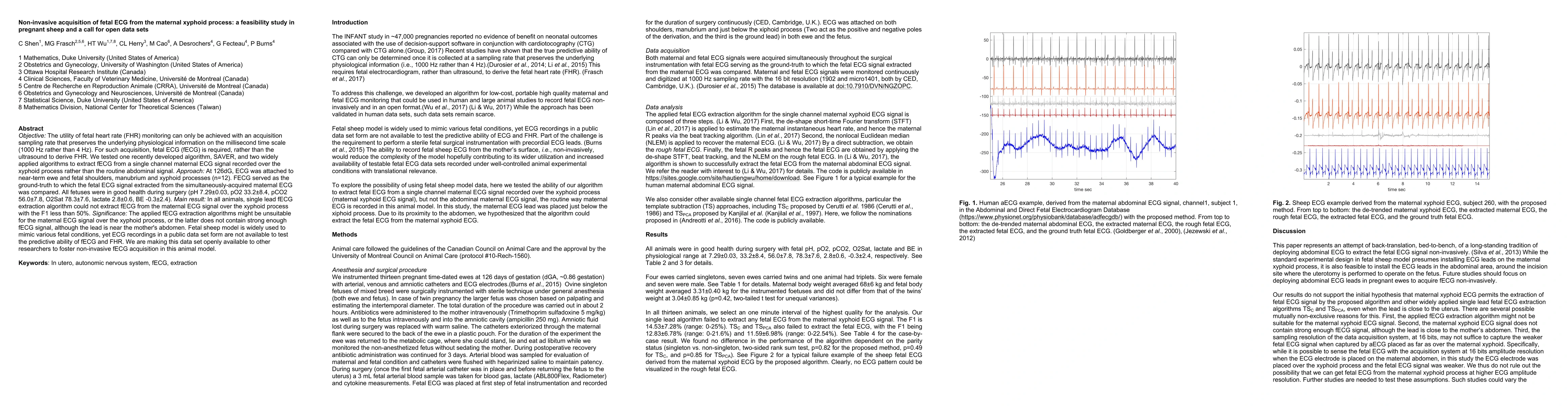 This study investigates the feasibility of extracting fetal ECG (fECG) from the maternal xyphoid process in pregnant sheep using advanced algorithms. Despite high-sampling rate fetal heart rate monitoring being crucial, the tested algorithms failed to extract fECG effectively, suggesting the xyphoid lead may not provide sufficient signal. The authors are releasing their data to encourage further research in non-invasive fECG acquisition.