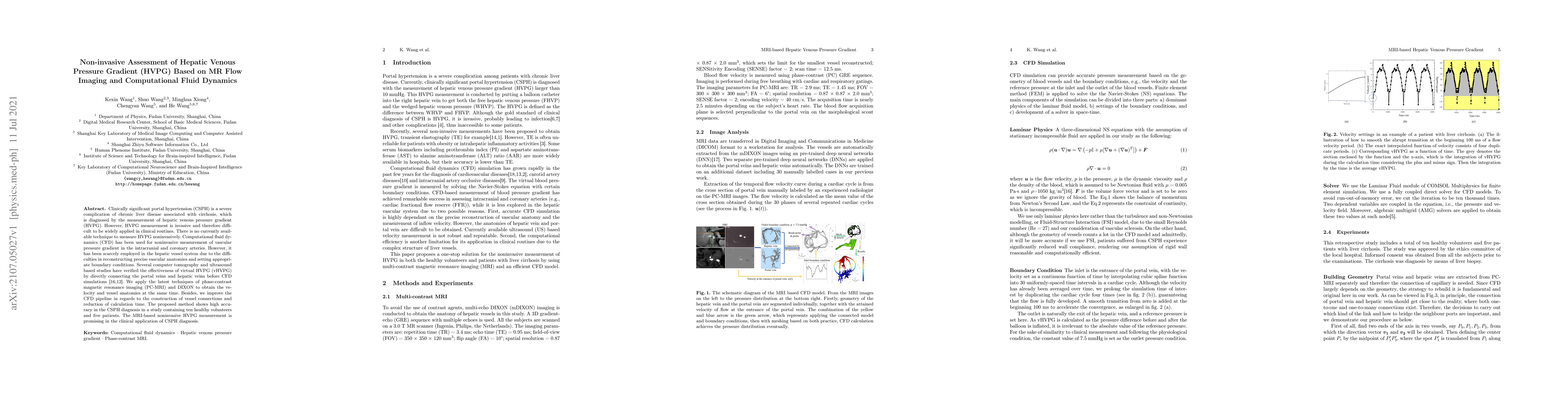This paper proposes a non-invasive method for assessing hepatic venous pressure gradient (HVPG) using magnetic resonance imaging (MRI) and computational fluid dynamics (CFD). The technique combines phase-contrast MRI and DIXON methods to obtain vessel velocities and anatomies, showing high accuracy in diagnosing clinically significant portal hypertension in a small study.