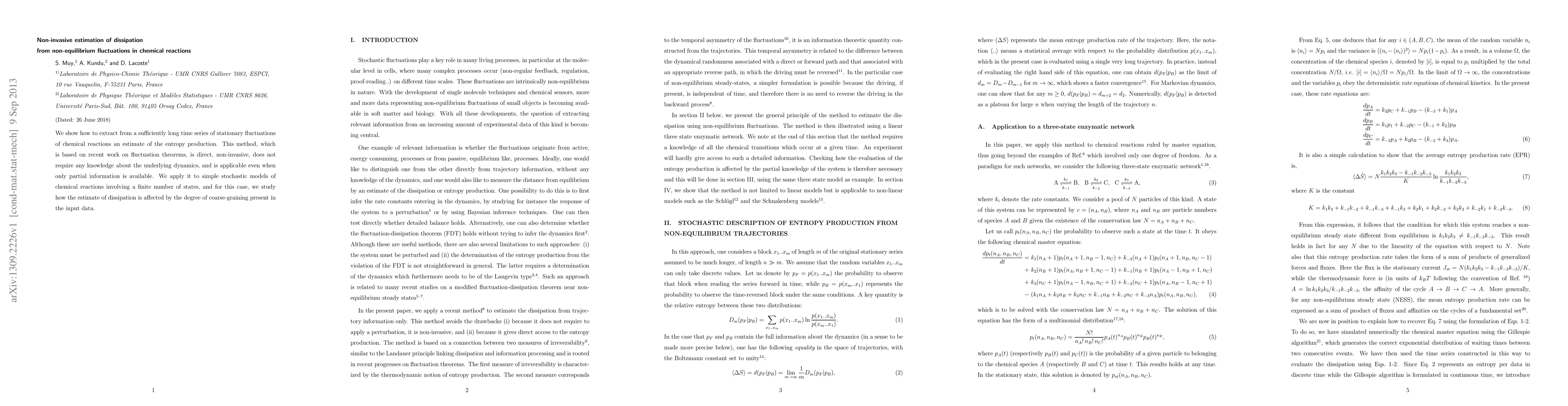 This paper presents a non-invasive method to estimate entropy production from time series of stationary fluctuations in chemical reactions, based on fluctuation theorems, applicable without detailed knowledge of the underlying dynamics. The method is tested on simple stochastic models, examining the impact of data coarse-graining on the dissipation estimate.