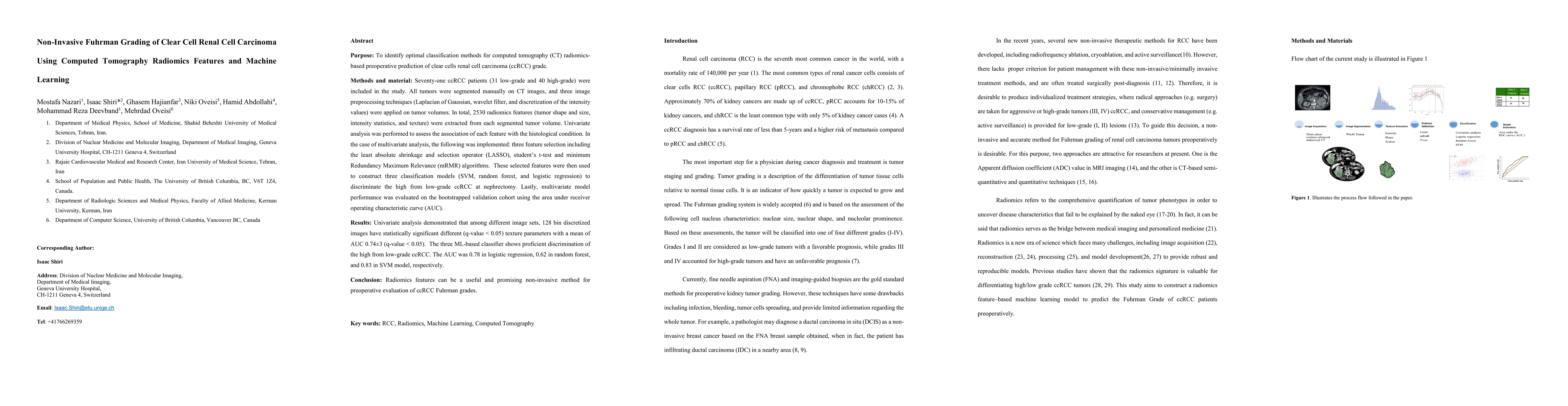 This study explores the use of CT radiomics features and machine learning to non-invasively predict the Fuhrman grade of clear cell renal cell carcinoma (ccRCC) preoperatively. The study found that SVM, logistic regression, and random forest classifiers showed AUCs of 0.83, 0.78, and 0.62 respectively, indicating potential for accurate grade discrimination.