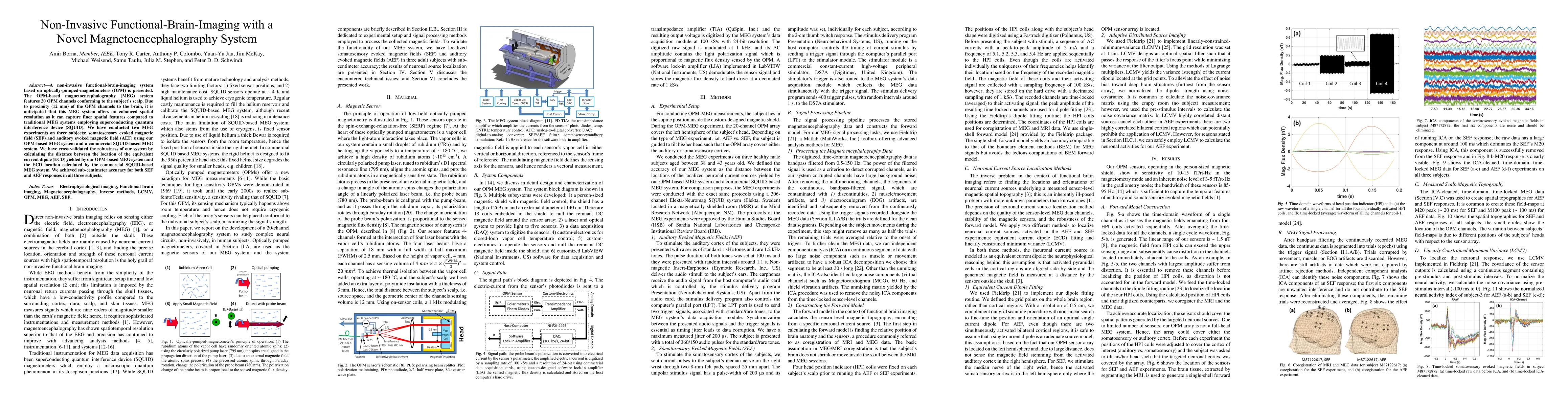 A non-invasive functional-brain-imaging system based on optically-pumped-magnetometers (OPM) is presented. The OPM-based magnetoencephalography (MEG) system features 20 OPM channels conforming to the subject's scalp. Due to proximity (12 mm) of the OPM channels to the brain, it is anticipated that this MEG system offers an enhanced spatial resolution as it can capture finer spatial features compared to traditional MEG systems employing superconducting quantum interference device (SQUID). We have conducted two MEG experiments on three subjects: somatosensory evoked magnetic field (SEF) and auditory evoked magnetic field (AEF) using our OPM-based MEG system and a commercial SQUID-based MEG system. We have cross validated the robustness of our system by calculating the distance between the location of the equivalent current dipole (ECD) yielded by our OPM-based MEG system and the ECD location calculated by the commercial SQUID-based MEG system. We achieved sub-centimeter accuracy for both SEF and AEF responses in all three subjects.