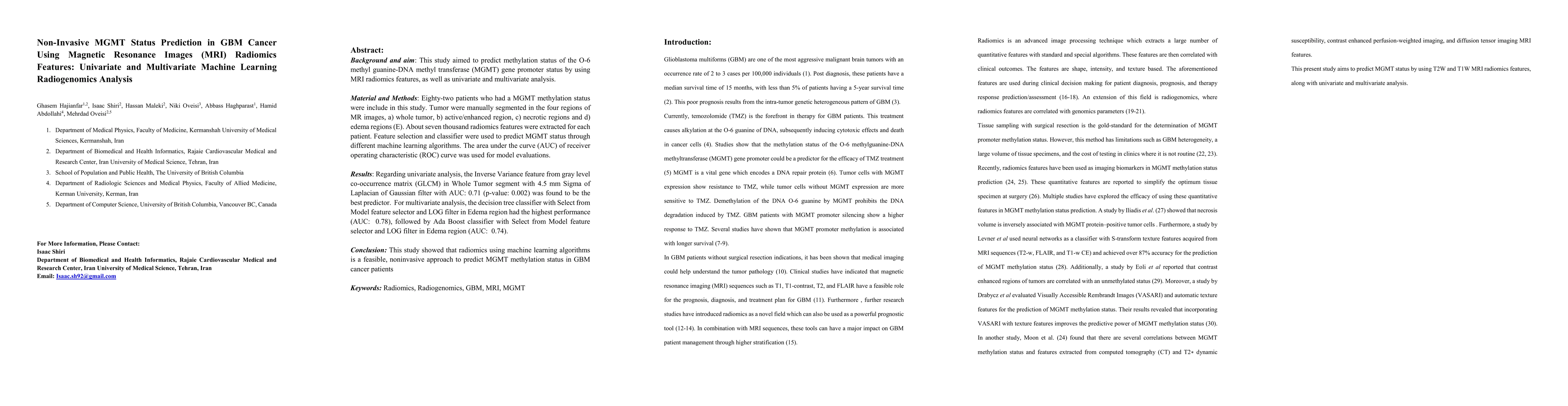 Background and aim: This study aimed to predict methylation status of the O-6 methyl guanine-DNA methyl transferase (MGMT) gene promoter status by using MRI radiomics features, as well as univariate and multivariate analysis. Material and Methods: Eighty-two patients who had a MGMT methylation status were include in this study. Tumor were manually segmented in the four regions of MR images, a) whole tumor, b) active/enhanced region, c) necrotic regions and d) edema regions (E). About seven thousand radiomics features were extracted for each patient. Feature selection and classifier were used to predict MGMT status through different machine learning algorithms. The area under the curve (AUC) of receiver operating characteristic (ROC) curve was used for model evaluations. Results: Regarding univariate analysis, the Inverse Variance feature from gray level co-occurrence matrix (GLCM) in Whole Tumor segment with 4.5 mm Sigma of Laplacian of Gaussian filter with AUC: 0.71 (p-value: 0.002) was found to be the best predictor. For multivariate analysis, the decision tree classifier with Select from Model feature selector and LOG filter in Edema region had the highest performance (AUC: 0.78), followed by Ada Boost classifier with Select from Model feature selector and LOG filter in Edema region (AUC: 0.74). Conclusion: This study showed that radiomics using machine learning algorithms is a feasible, noninvasive approach to predict MGMT methylation status in GBM cancer patients Keywords: Radiomics, Radiogenomics, GBM, MRI, MGMT