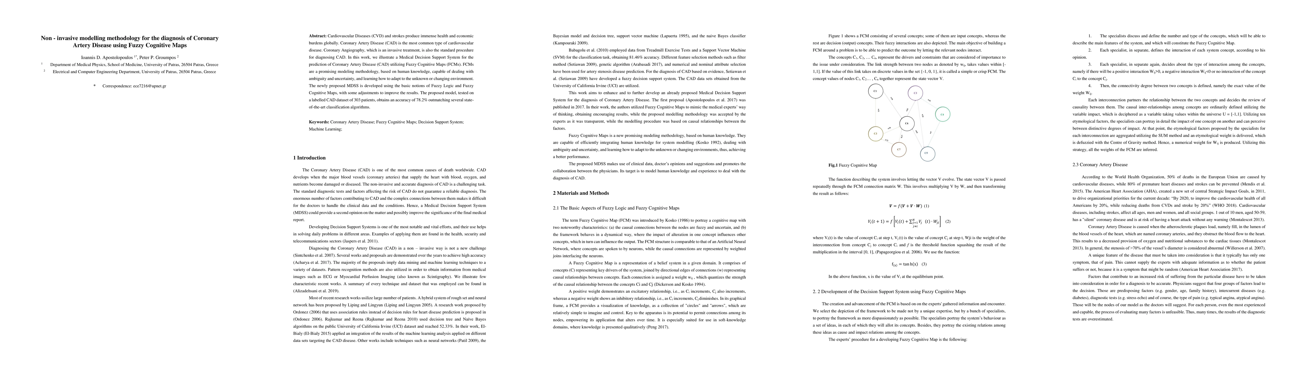 This paper proposes a non-invasive Medical Decision Support System using Fuzzy Cognitive Maps to predict Coronary Artery Disease, achieving 78.2% accuracy and outperforming other classification algorithms. The methodology leverages Fuzzy Logic to handle ambiguity and adapt to changing conditions.