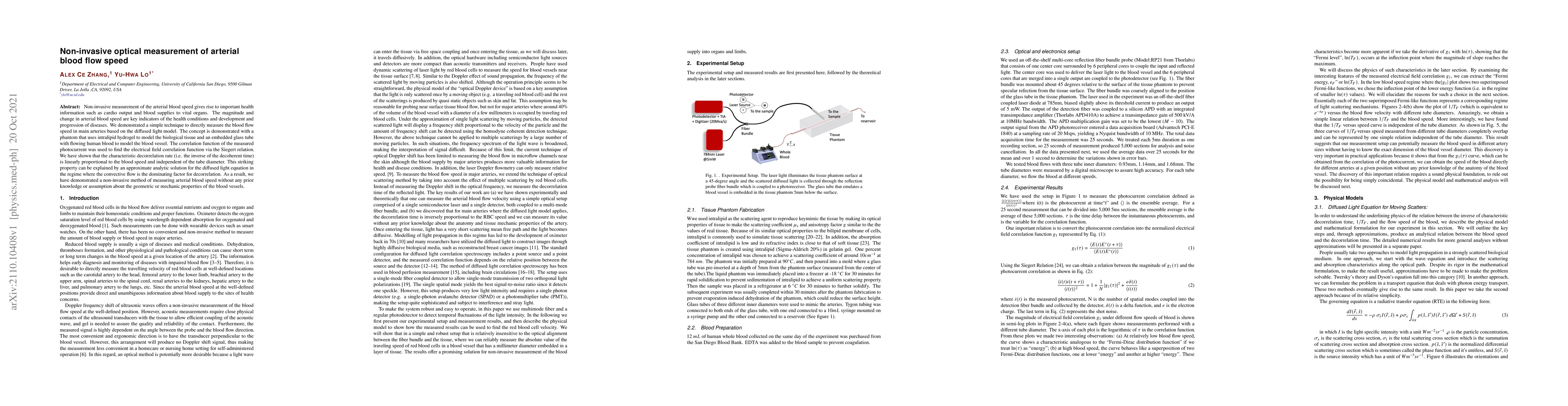 This paper presents a non-invasive optical technique to measure arterial blood flow speed using diffused light, demonstrating a correlation between the decorrelation rate and blood speed. The method, validated with a phantom, shows independence from vessel diameter and provides insights into cardiovascular health.