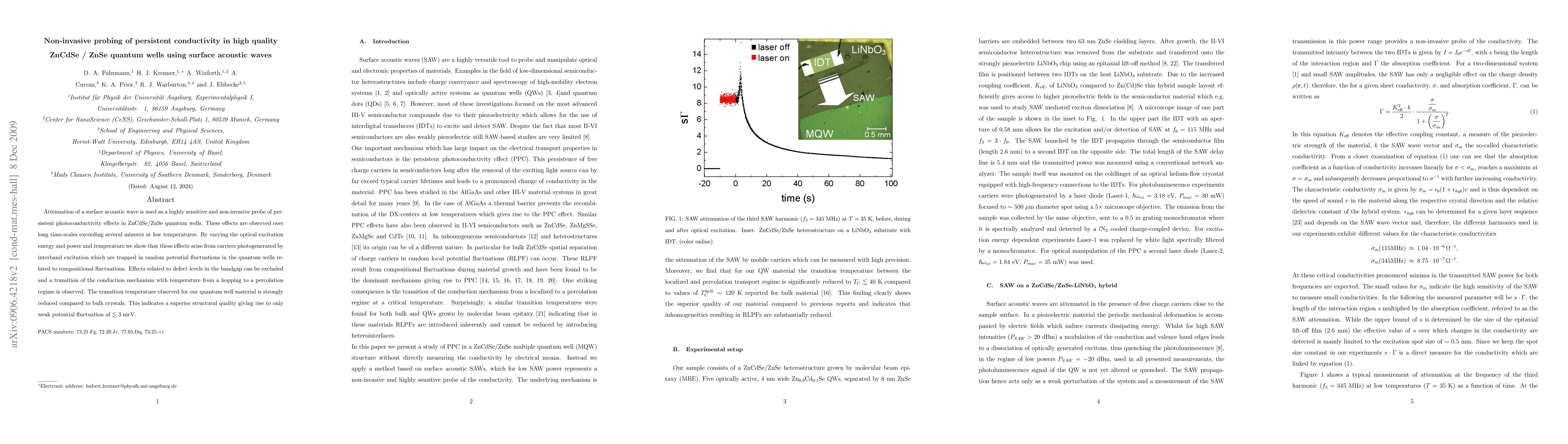 Temperature dependence and recombination behavior of trapped charge carriers in ZnCdSe/ZnSe multiple quantum wells are investigated employing surface acoustic waves. These weakly perturb the carrier system, but remain highly sensitive even at small conductivities. Using this non-invasive probe we are able to detect persistent photoconductivity minutes after optical excitation. Measurement of exciting photon energies, the temperature dependence and ability to quench the conductivity with energies lower than the bandgap, support the notion of spatial separation of electrons and holes in the wells, due to random local potential fluctuations possibly induced by compositional fluctuations.
