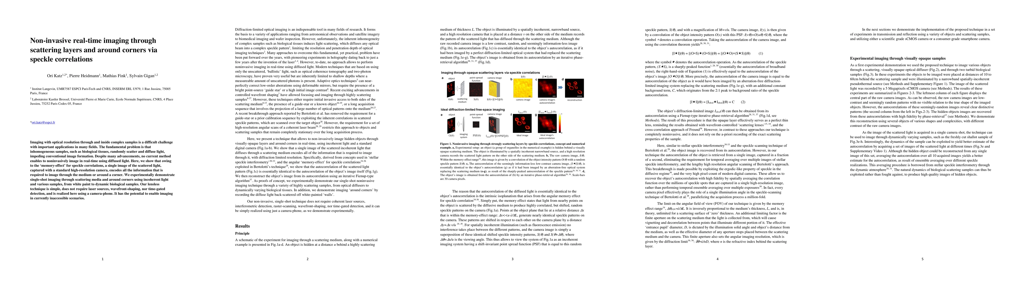 This paper presents a novel lensless technique for non-invasive real-time imaging through scattering layers and around corners using speckle correlations. The method captures a single image of scattered light to reconstruct images, demonstrated with various samples, offering potential for imaging in challenging scenarios.