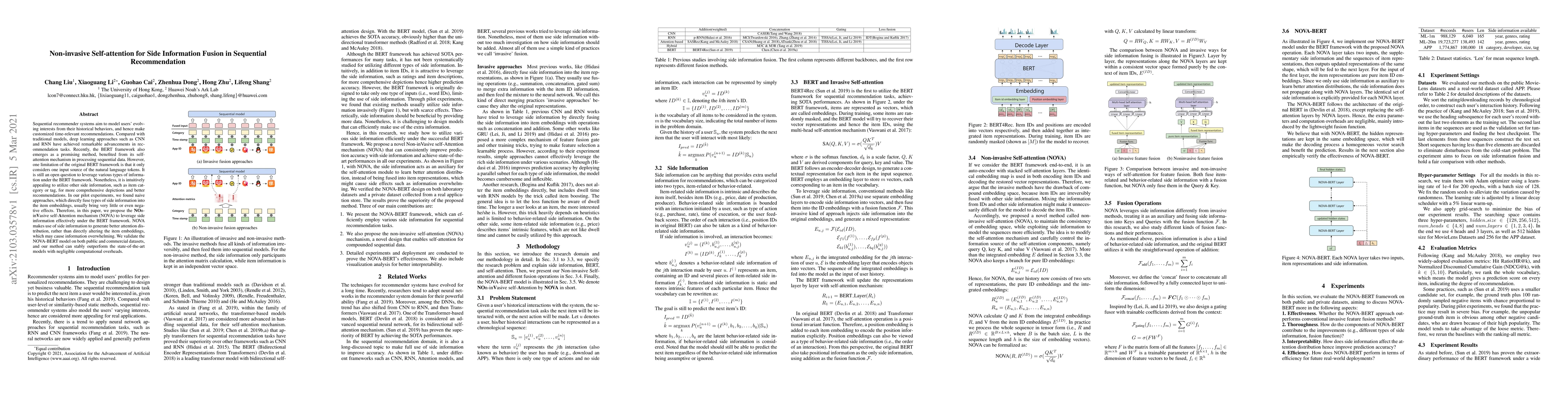 This paper proposes the NOninVasive self-attention mechanism (NOVA) to effectively integrate side information within the BERT framework for sequential recommendation systems. Unlike naive fusion methods, NOVA enhances attention distribution without directly altering item embeddings, leading to improved performance with minimal computational cost.