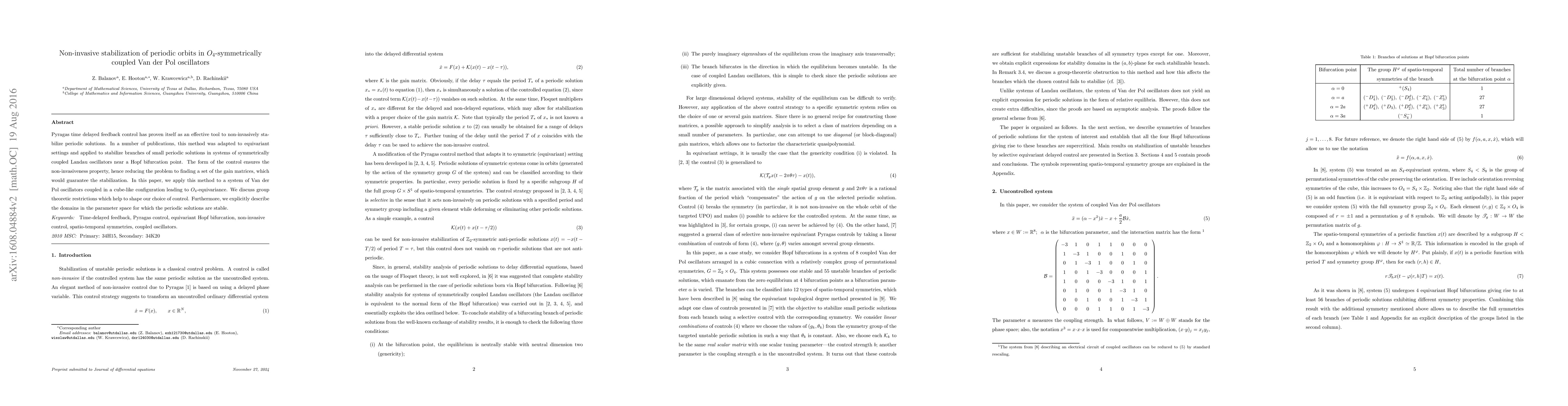 Pyragas time delayed feedback control has proven itself as an effective tool to non-invasively stabilize periodic solutions. In a number of publications, this method was adapted to equivariant settings and applied to stabilize branches of small periodic solutions in systems of symmetrically coupled Landau oscillators near a Hopf bifurcation point. The form of the control ensures the non-invasiveness property, hence reducing the problem to finding a set of the gain matrices, which would guarantee the stabilization. In this paper, we apply this method to a system of Van der Pol oscillators coupled in a cube-like configuration leading to $O_4$-equivariance. We discuss group theoretic restrictions which help to shape our choice of control. Furthermore, we explicitly describe the domains in the parameter space for which the periodic solutions are stable.