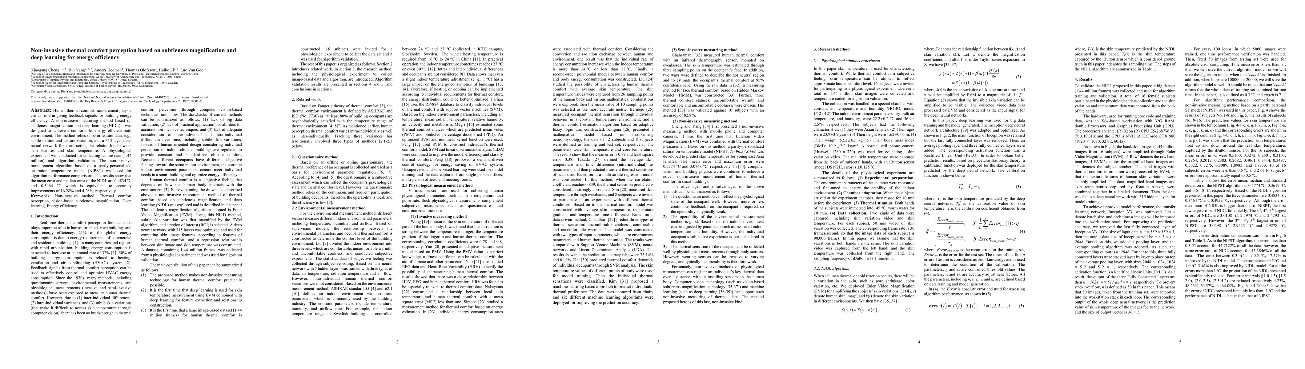 This paper proposes a non-invasive thermal comfort measurement method using subtleness magnification and deep learning (NIDL) to enhance building energy efficiency. The NIDL method leverages skin feature data and a deep neural network to correlate skin features with temperature, achieving improved accuracy over existing models.