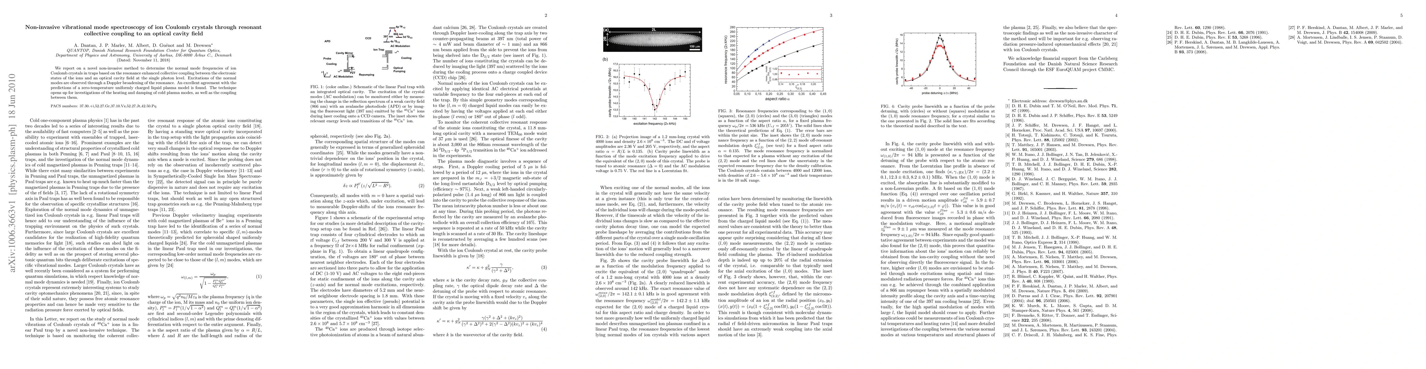 This paper introduces a non-invasive method for measuring the normal mode frequencies of ion Coulomb crystals using resonant collective coupling with an optical cavity field. The technique reveals excitations through Doppler broadening and aligns well with theoretical models of cold plasma.
