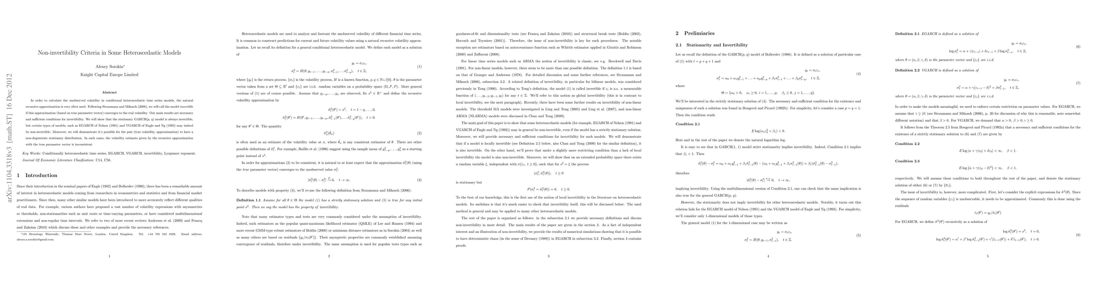 In order to calculate the unobserved volatility in conditional heteroscedastic time series models, the natural recursive approximation is very often used. Following \cite{StraumannMikosch2006}, we will call the model \emph{invertible} if this approximation (based on true parameter vector) converges to the real volatility. Our main results are necessary and sufficient conditions for invertibility. We will show that the stationary GARCH($p$, $q$) model is always invertible, but certain types of models, such as EGARCH of \cite{Nelson1991} and VGARCH of \cite{EngleNg1993} may indeed be non-invertible. Moreover, we will demonstrate it's possible for the pair (true volatility, approximation) to have a non-degenerate stationary distribution. In such cases, the volatility estimate given by the recursive approximation with the true parameter vector is inconsistent.