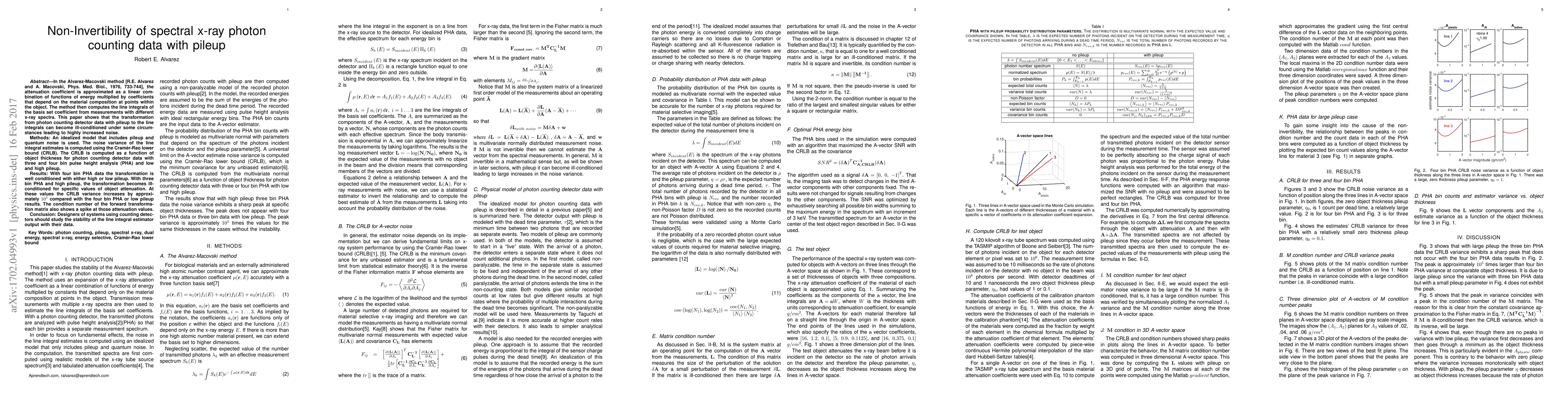 -In the Alvarez-Macovski method [R.E. Alvarez and A. Macovski, Phys. Med. Biol., 1976, 733-744], the attenuation coefficient is approximated as a linear combination of functions of energy multiplied by coefficients that depend on the material composition at points within the object. The method then computes the line integrals of the basis set coefficient from measurements with different x-ray spectra. This paper shows that the transformation from photon counting detector data with pileup to the line integrals can become ill-conditioned under some circumstances leading to highly increased noise. Methods: An idealized model that includes pileup and quantum noise is used. The noise variance of the line integral estimates is computed using the Cram{\`e}r-Rao lower bound (CRLB). The CRLB is computed as a function of object thickness for photon counting detector data with three and four bin pulse height analysis (PHA) and low and high pileup. Results: With four bin PHA data the transformation is well conditioned with either high or low pileup. With three bin PHA and high pileup, the transformation becomes ill-conditioned for specific values of object attenuation. At these values the CRLB variance increases by approximately 10 5 compared with the four bin PHA or low pileup results. The condition number of the forward transformation matrix also shows a spike at those attenuation values. Conclusion: Designers of systems using counting detectors should study the stability of the line integral estimator output with their data.