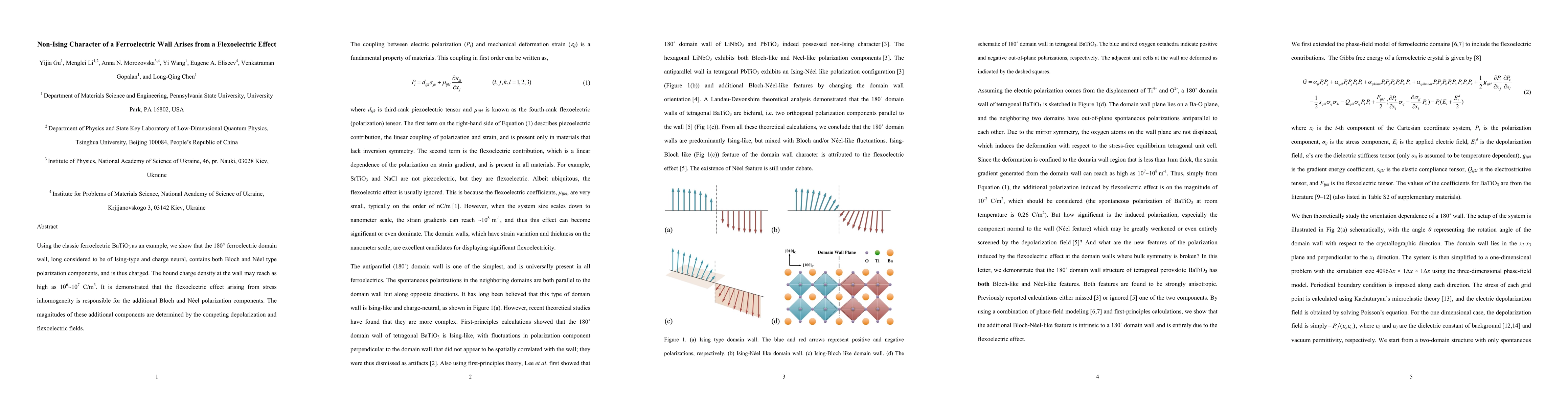This paper demonstrates that the ferroelectric domain wall in BaTiO$_3$ exhibits non-Ising characteristics due to flexoelectric effects, revealing both Bloch and Neel polarization components and a significant bound charge density. The flexoelectric effect, driven by stress inhomogeneity, is identified as the source of these additional polarization components.