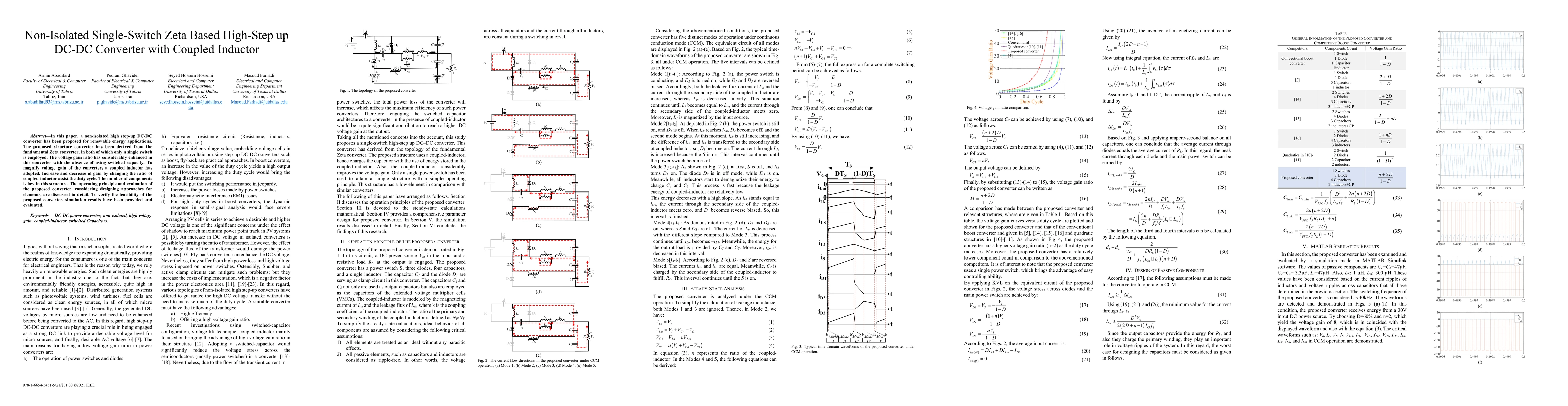 This paper proposes a non-isolated, single-switch high-step up DC-DC converter based on the Zeta topology, utilizing a coupled inductor to enhance voltage gain without additional switches. Simulation results validate the converter's efficiency and design principles.