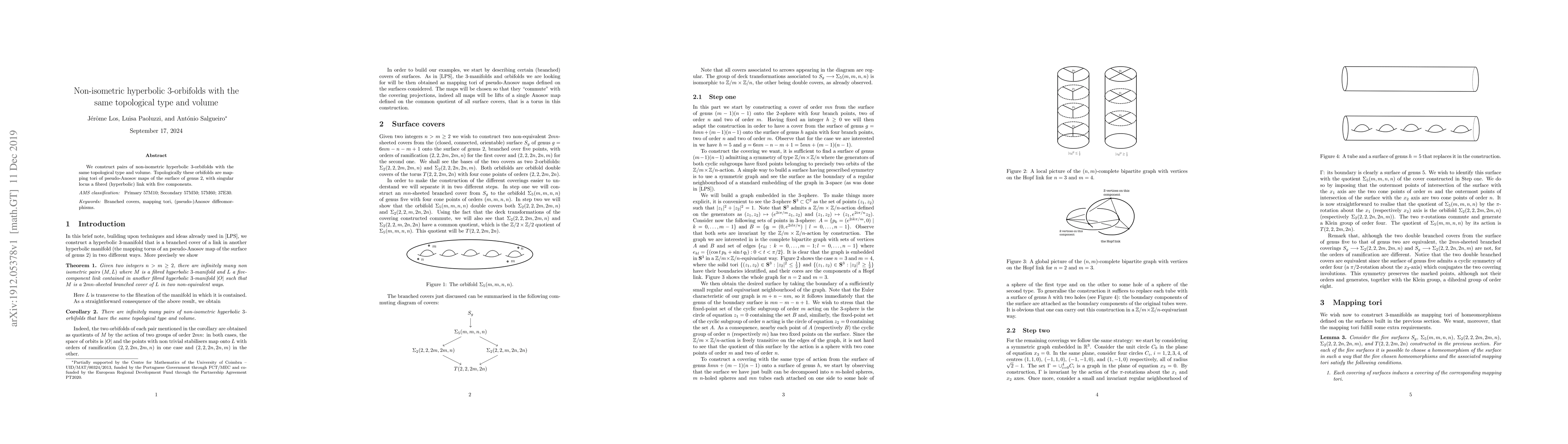Summary: This paper constructs pairs of non-isometric hyperbolic 3-orbifolds sharing the same topological type and volume, demonstrating that topological equivalence does not imply isometry. These orbifolds are mapping tori of pseudo-Anosov maps on a genus 2 surface.