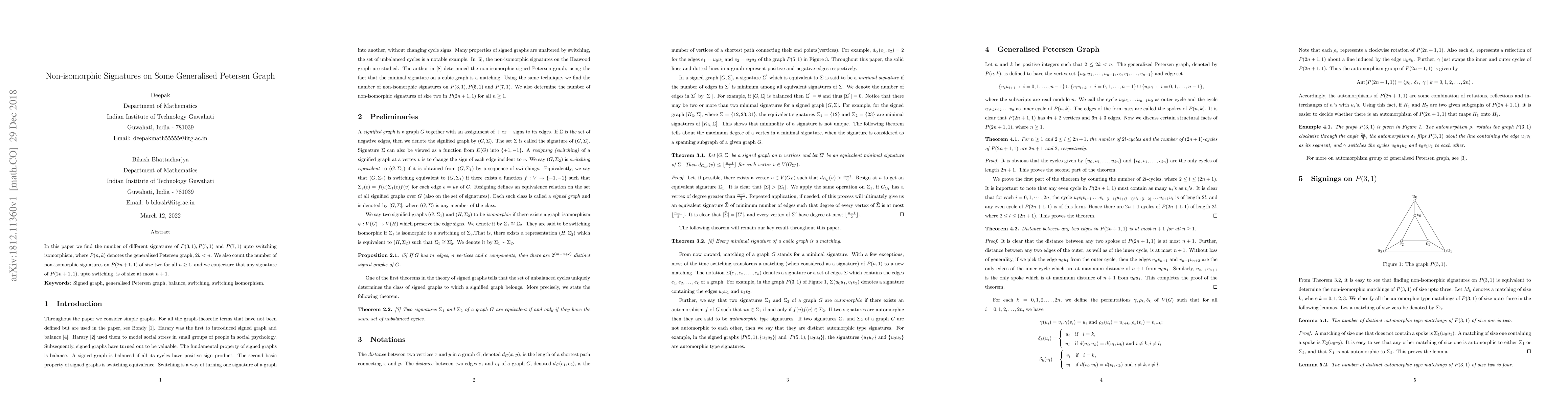 In this paper we find the number of different signatures of $P(3,1), P(5,1)$ and $P(7,1)$ upto switching isomorphism, where $P(n, k)$ denotes the generalised Petersen graph, $2k < n$. We also count the number of non-isomorphic signatures on $P(2n+1,1)$ of size two for all $n \geq 1$, and we conjecture that any signature of $P(2n+1,1)$, upto switching, is of size at most $n+1$.