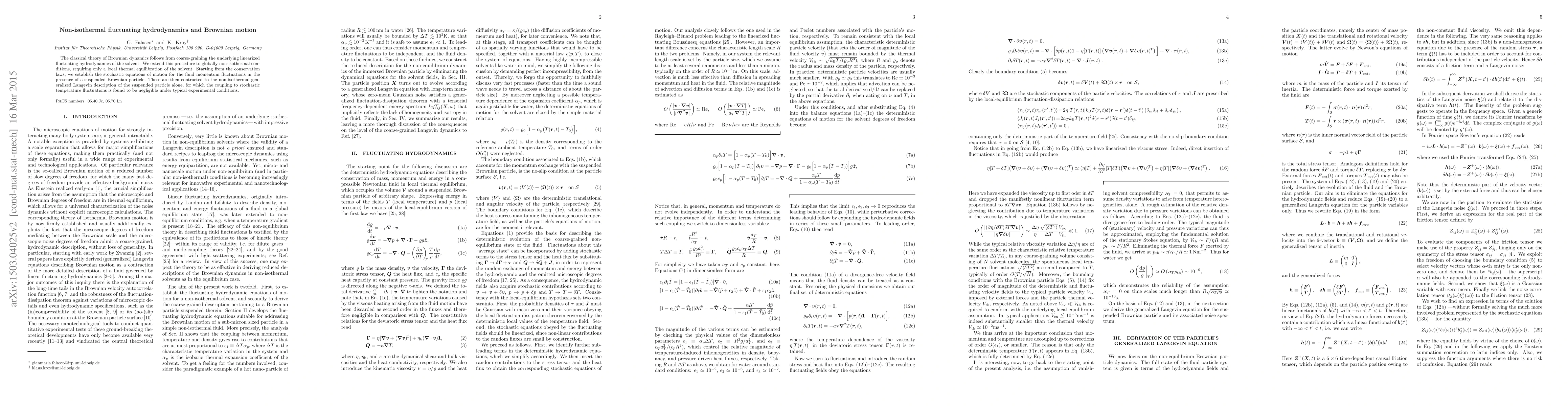 This paper extends classical Brownian dynamics to non-isothermal conditions by coarse-graining fluctuating hydrodynamics, deriving stochastic equations of motion for fluid momentum fluctuations, and establishing a non-isothermal generalized Langevin description for a suspended particle. The coupling to temperature fluctuations is found to be negligible under typical experimental settings.