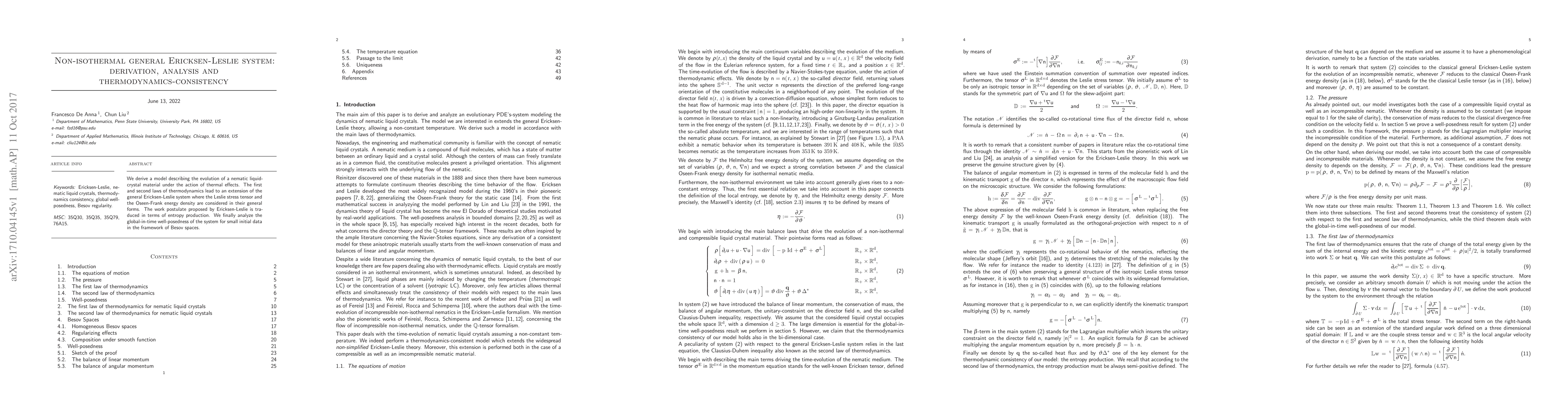 This paper derives a non-isothermal extension of the Ericksen-Leslie system for nematic liquid-crystals, incorporating thermodynamic principles and entropy production. It also analyzes the global-in-time well-posedness of the system for small initial data within the Besov spaces framework.
