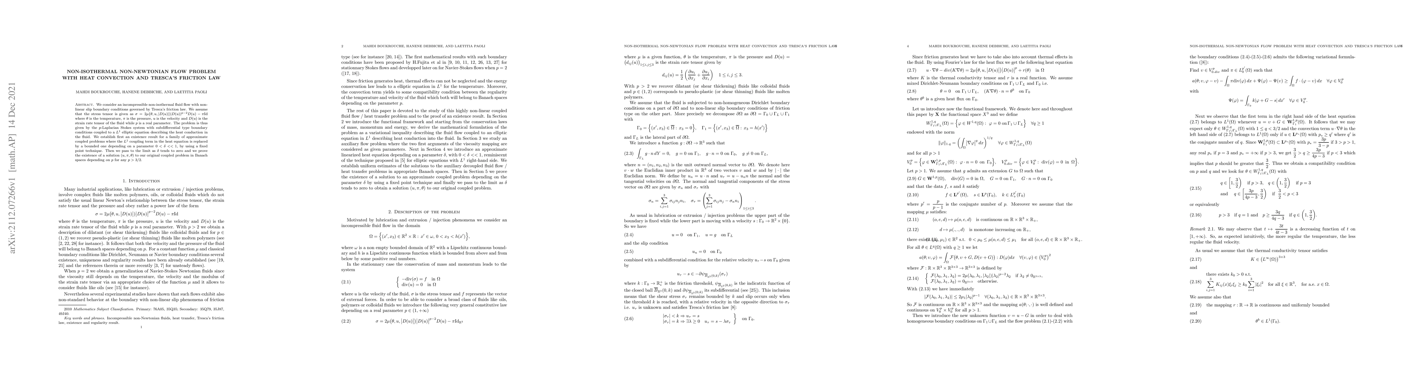 We consider an incompressible non-isothermal fluid flow with non-linear slip boundary conditions governed by Tresca's friction law. We assume that the stress tensor is given as $\sigma = 2 \mu\bigl( \theta, u, | D(u) |) |D(u) |^{p-2} D(u) - \pi {\rm Id}$ where $\theta$ is the temperature, $\pi$ is the pressure, $u$ is the velocity and $D(u)$ is the strain rate tensor of the fluid while $p$ is a real parameter. The problem is thus given by the $p$-Laplacian Stokes system with subdifferential type boundary conditions coupled to a $L^1$ elliptic equation describing the heat conduction in the fluid. We establish first an existence result for a family of approximate coupled problems where the $L^1$ coupling term in the heat equation is replaced by a bounded one depending on a parameter $0<\delta <<1$, by using a fixed point technique. Then we pass to the limit as $\delta$ tends to zero and we prove the existence of a solution $(u, \pi, \theta)$ to our original coupled problem in Banach spaces depending on $p$ for any $p > 3/2$.