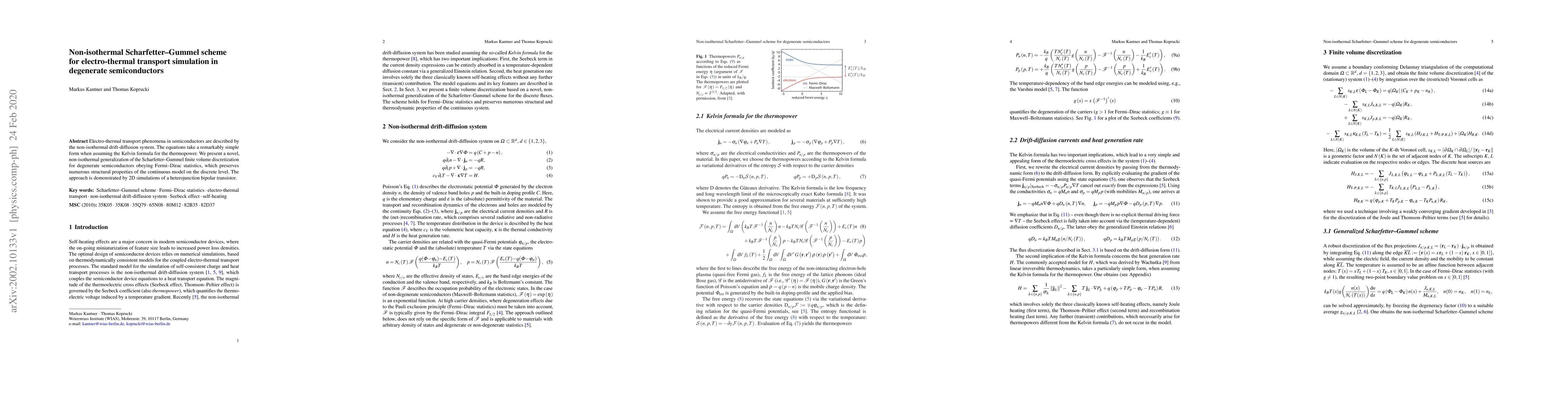 Electro-thermal transport phenomena in semiconductors are described by the non-isothermal drift-diffusion system. The equations take a remarkably simple form when assuming the Kelvin formula for the thermopower. We present a novel, non-isothermal generalization of the Scharfetter-Gummel finite volume discretization for degenerate semiconductors obeying Fermi-Dirac statistics, which preserves numerous structural properties of the continuous model on the discrete level. The approach is demonstrated by 2D simulations of a heterojunction bipolar transistor.