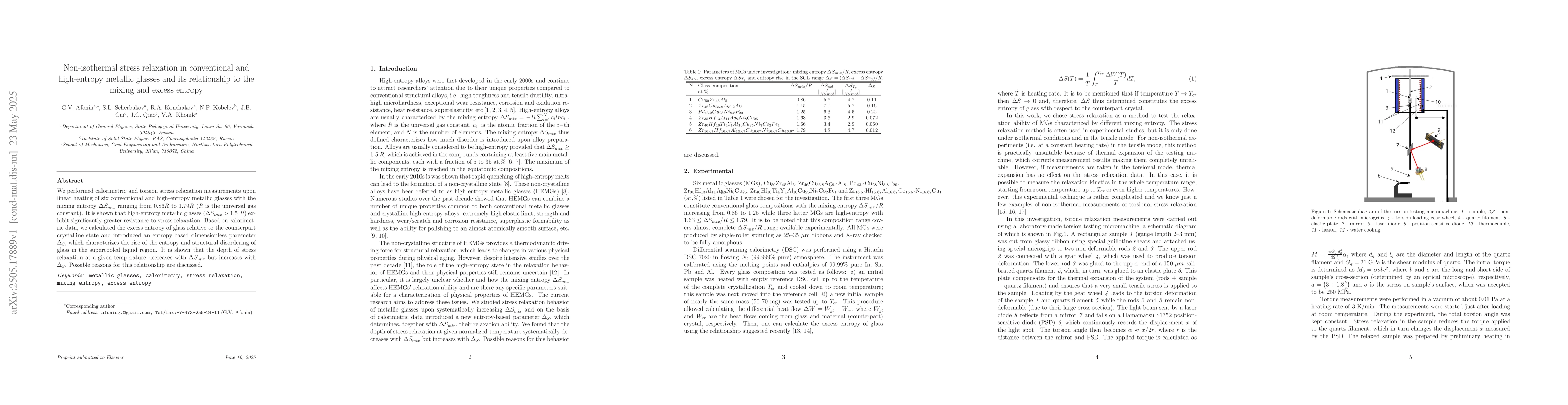 Calorimetric and torsion stress relaxation measurements were conducted on six conventional and high-entropy metallic glasses during linear heating, examining mixing entropy (ΔSmix) ranging from 0.86R to 1.79R (R is the universal gas constant).