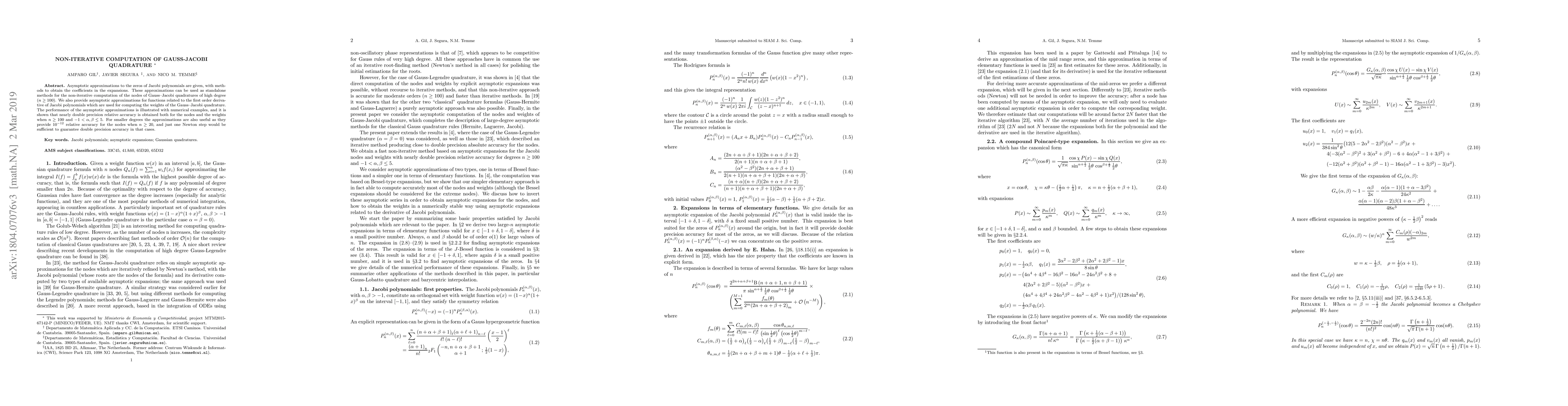 This paper presents non-iterative methods for computing Gauss-Jacobi quadrature nodes and weights using asymptotic approximations for Jacobi polynomials, achieving nearly double precision accuracy for high degrees ($n\ge 100$) and $10^{-12}$ relative accuracy for nodes when $n\ge 20$.