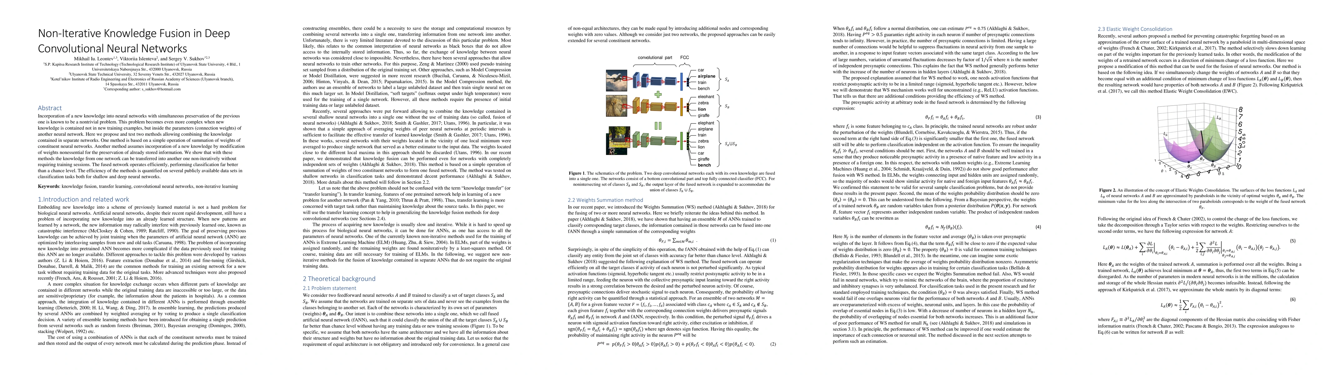 Incorporation of a new knowledge into neural networks with simultaneous preservation of the previous one is known to be a nontrivial problem. This problem becomes even more complex when new knowledge is contained not in new training examples, but inside the parameters (connection weights) of another neural network. Here we propose and test two methods allowing combining the knowledge contained in separate networks. One method is based on a simple operation of summation of weights of constituent neural networks. Another method assumes incorporation of a new knowledge by modification of weights nonessential for the preservation of already stored information. We show that with these methods the knowledge from one network can be transferred into another one non-iteratively without requiring training sessions. The fused network operates efficiently, performing classification far better than a chance level. The efficiency of the methods is quantified on several publicly available data sets in classification tasks both for shallow and deep neural networks.