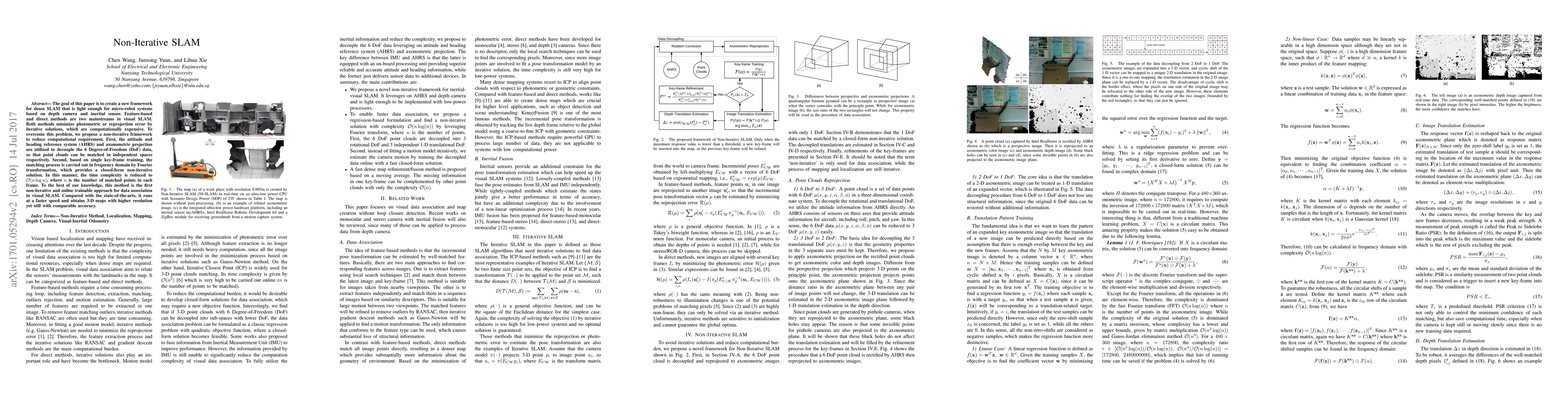 The goal of this paper is to create a new framework for dense SLAM that is light enough for micro-robot systems based on depth camera and inertial sensor. Feature-based and direct methods are two mainstreams in visual SLAM. Both methods minimize photometric or reprojection error by iterative solutions, which are computationally expensive. To overcome this problem, we propose a non-iterative framework to reduce computational requirement. First, the attitude and heading reference system (AHRS) and axonometric projection are utilized to decouple the 6 Degree-of-Freedom (DoF) data, so that point clouds can be matched in independent spaces respectively. Second, based on single key-frame training, the matching process is carried out in frequency domain by Fourier transformation, which provides a closed-form non-iterative solution. In this manner, the time complexity is reduced to $\mathcal{O}(n \log{n})$, where $n$ is the number of matched points in each frame. To the best of our knowledge, this method is the first non-iterative and online trainable approach for data association in visual SLAM. Compared with the state-of-the-arts, it runs at a faster speed and obtains 3-D maps with higher resolution yet still with comparable accuracy.