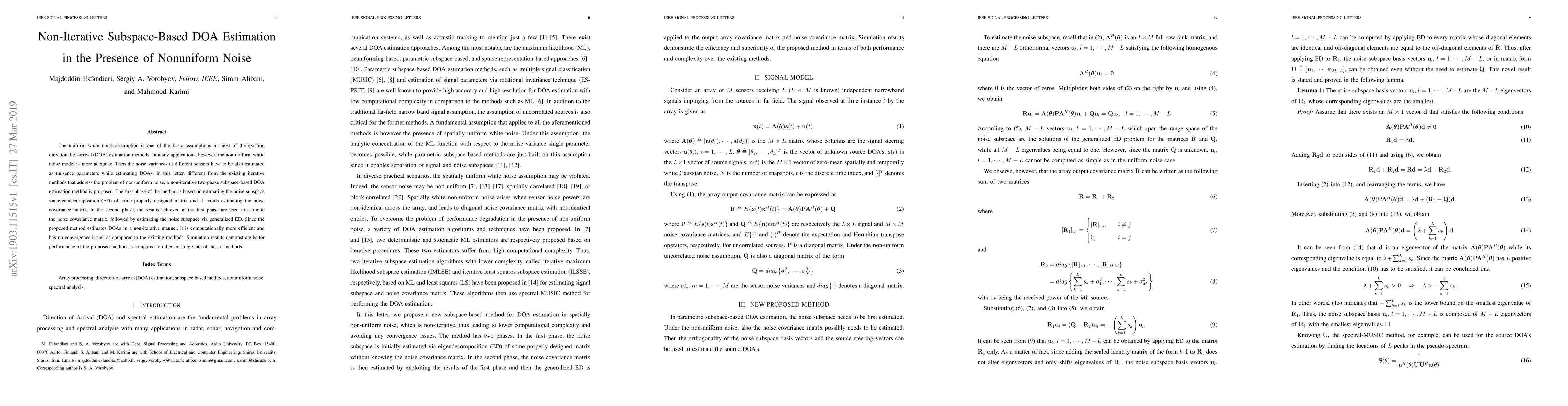 This paper proposes a non-iterative two-phase subspace-based method for directional-of-arrival (DOA) estimation in nonuniform noise environments. It avoids iterative processes and estimates noise subspaces directly, demonstrating computational efficiency and superior performance over existing methods.