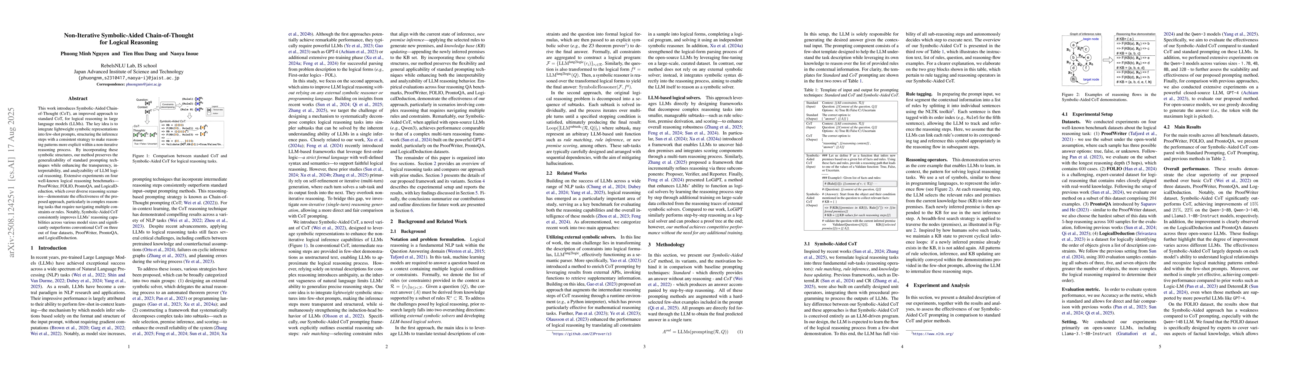 Unlike previous methods that either use LLMs for translating logical problems into inputs for symbolic reasoners or for performing small constituent logical reasoning steps, Symbolic-Aided CoT directly improves the logical reasoning capability of LLMs with a simple, flexible, and non-iterative approach.