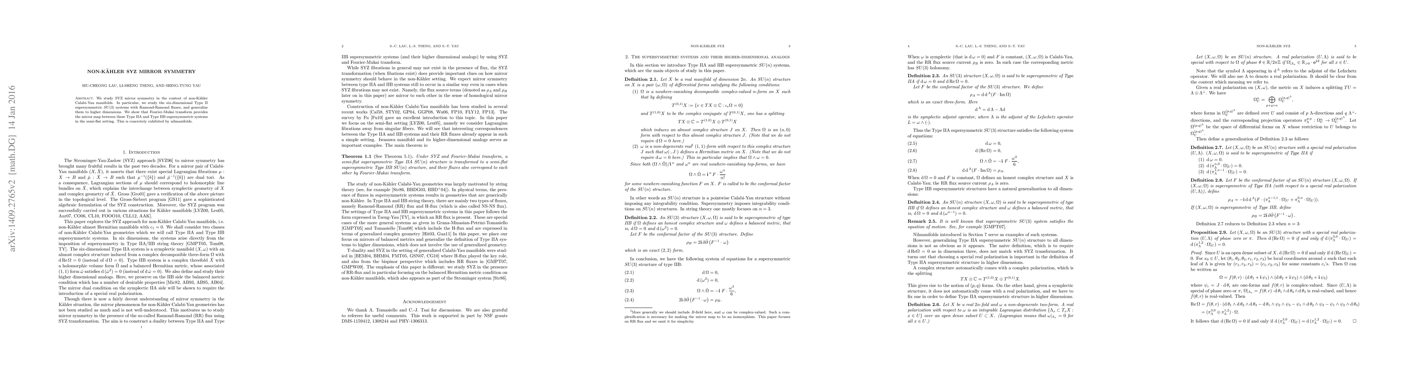 We study SYZ mirror symmetry in the context of non-Kaehler Calabi-Yau manifolds. In particular, we study the six-dimensional Type II supersymmetric $SU(3)$ systems with Ramond-Ramond fluxes, and generalize them to higher dimensions. We show that Fourier-Mukai transform provides the mirror map between these Type IIA and Type IIB supersymmetric systems in the semi-flat setting. This is concretely exhibited by nilmanifolds.