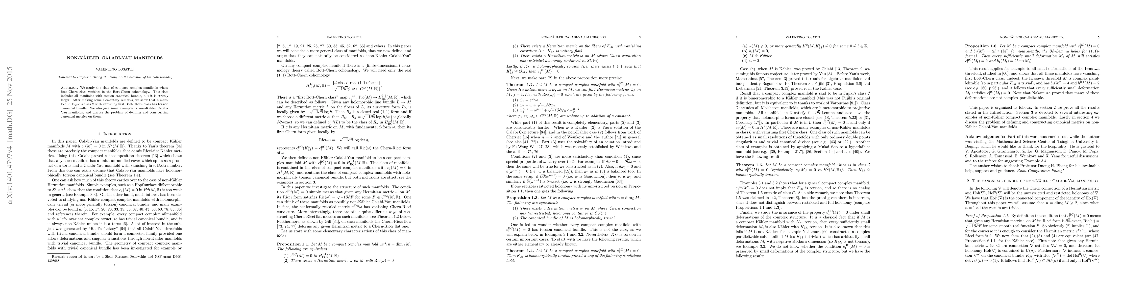 This paper explores compact complex manifolds with vanishing first Bott-Chern cohomology class, focusing on those with torsion canonical bundles, and provides examples of non-Kähler Calabi-Yau manifolds along with discussions on canonical metrics.