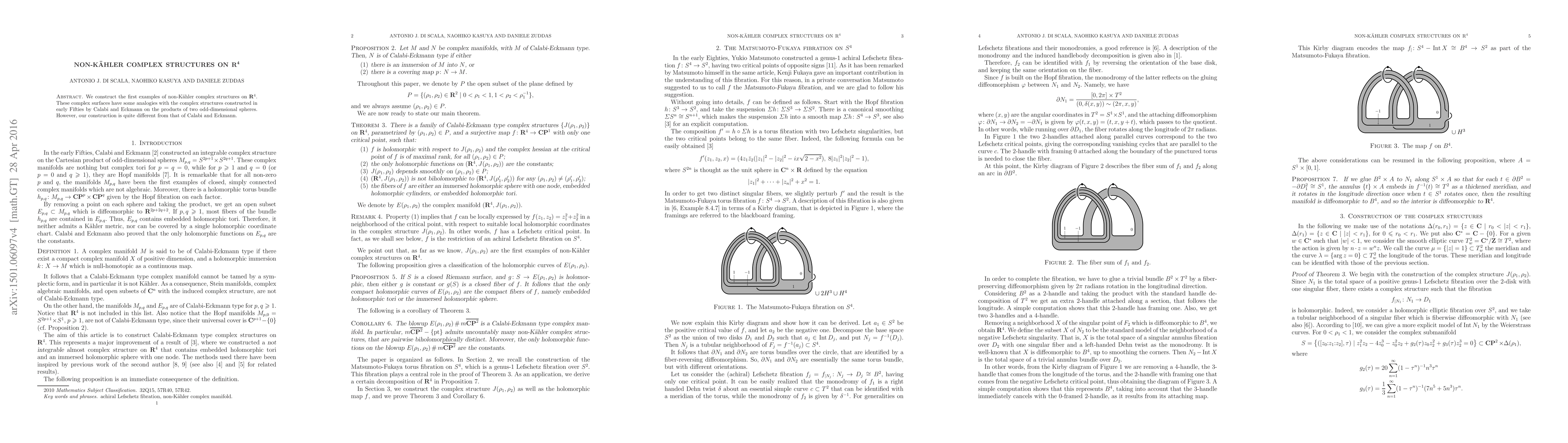 The paper presents the first examples of non-Kähler complex structures on $R^4$, offering a distinct construction method compared to the early Fifties work by Calabi and Eckmann on products of odd-dimensional spheres. These new complex surfaces share some analogies with previous works but are fundamentally different in their construction.