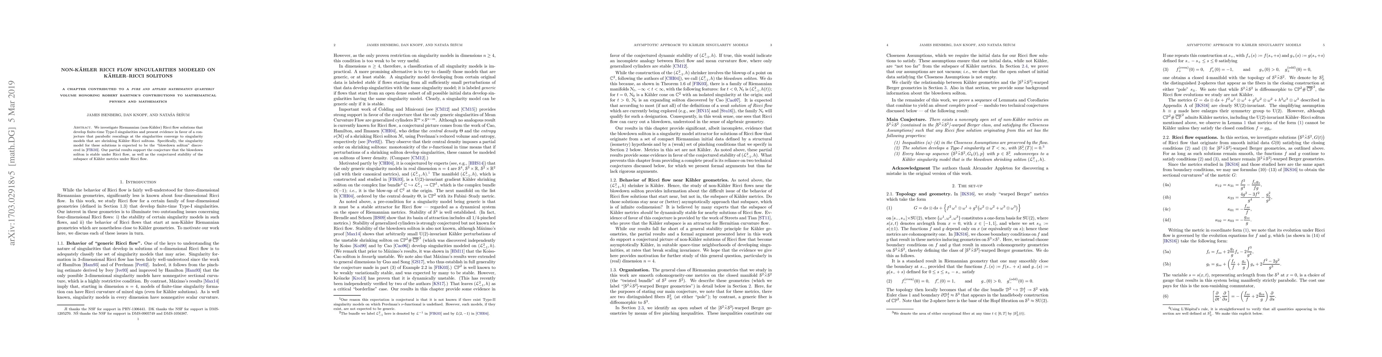 This research examines Riemannian Ricci flow solutions with Type-I singularities, proposing that parabolic rescalings converge to shrinking Kahler-Ricci solitons, specifically the "blowdown soliton." Partial results support the conjectured stability of this soliton and the subspace of Kahler metrics under Ricci flow.