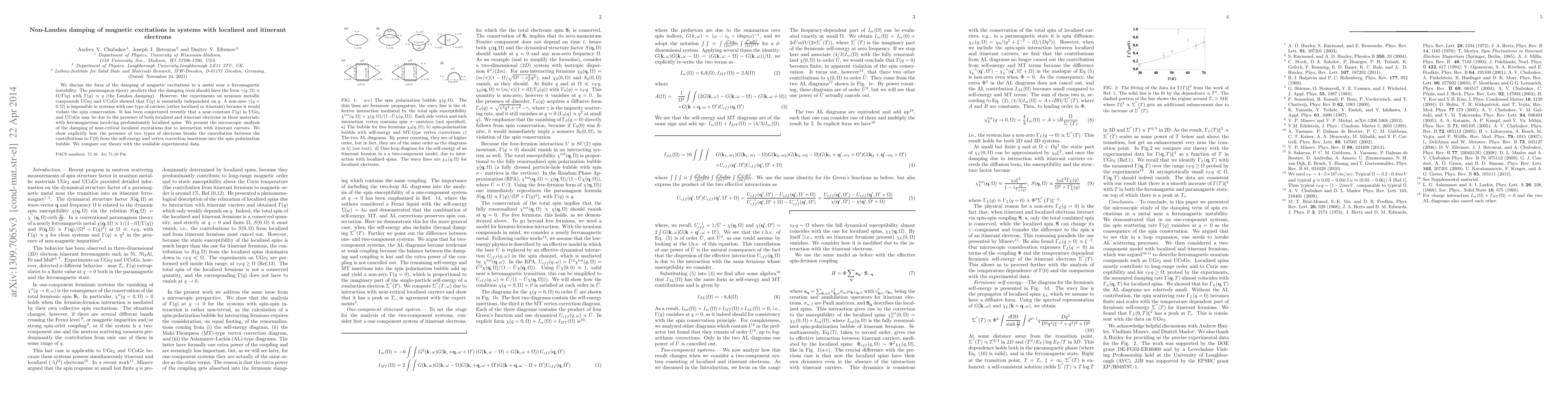 We discuss the form of the damping of magnetic excitations in a metal near a ferromagnetic instability. The paramagnon theory predicts that the damping term should have the form $\Omega/\Gamma (q)$ with $\Gamma (q) \propto q$ (the Landau damping). However, the experiments on uranium metallic compounds UGe$_2$ and UCoGe showed that $\Gamma (q)$ tends to a constant value at vanishing $q$. A non-zero $\Gamma (0)$ is impossible in systems with one type of carriers (either localized or itinerant) because it would violate the spin conservation. It has been conjectured recently that a non-zero $\Gamma (q)$ in UGe$_2$ and UCoGe may be due to the presence of both localized and itinerant electrons in these materials, with ferromagnetism involving predominantly localized spins. We present microscopic analysis of the damping of near-critical localized excitations due to interaction with itinerant carriers. We show explicitly how the presence of two types of electrons breaks the cancellation between the contributions to $\Gamma (0)$ from self-energy and vertex correction insertions into the spin polarization bubble and discuss the special role of the Aslamazov-Larkin processes. We show that $\Gamma (0)$ increases with $T$ both in the paramagnetic and ferromagnetic regions, but in-between it has a peak at $T_c$. We compare our theory with the available experimental data.