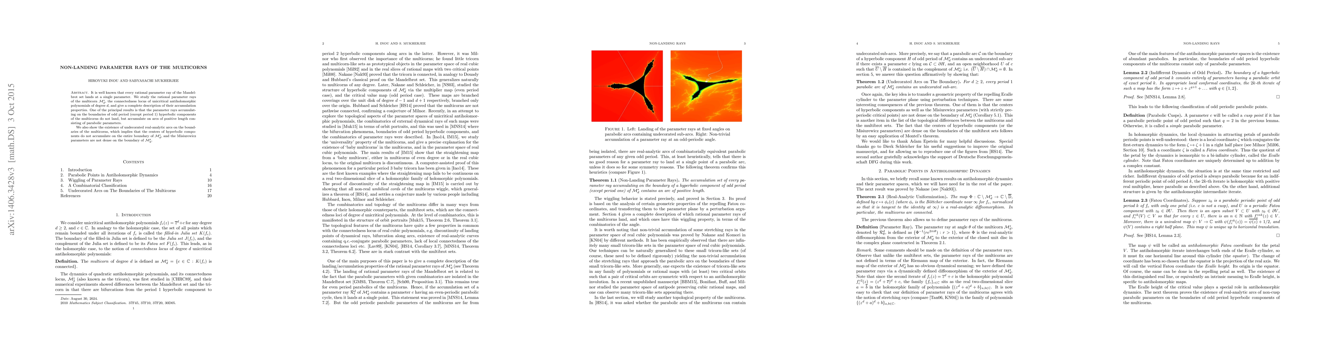It is well known that every rational parameter ray of the Mandelbrot set lands at a single parameter. We study the rational parameter rays of the multicorn $\mathcal{M}_d^*$, the connectedness locus of unicritical antiholomorphic polynomials of degree $d$, and give a complete description of their accumulation properties. One of the principal results is that the parameter rays accumulating on the boundaries of odd period (except period $1$) hyperbolic components of the multicorns do not land, but accumulate on arcs of positive length consisting of parabolic parameters. We also show the existence of undecorated real-analytic arcs on the boundaries of the multicorns, which implies that the centers of hyperbolic components do not accumulate on the entire boundary of $\mathcal{M}_d^*$, and the Misiurewicz parameters are not dense on the boundary of $\mathcal{M}_d^*$.