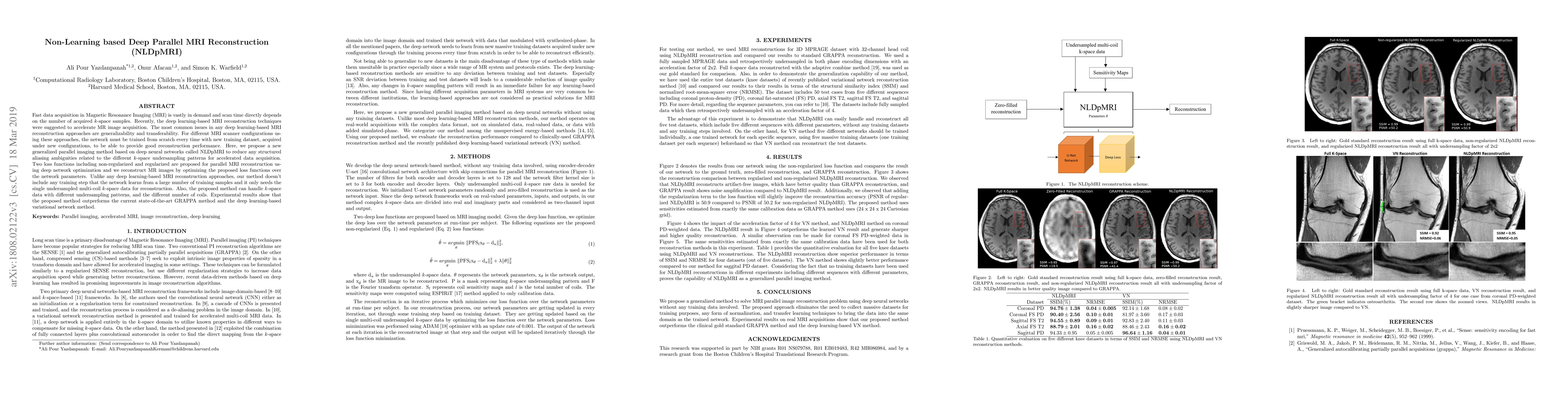The paper proposes a non-learning based deep parallel MRI reconstruction method (NLDpMRI) that reduces structured aliasing without training on large datasets. Unlike other deep learning methods, NLDpMRI optimizes reconstruction using two loss functions directly from undersampled k-space data, demonstrating superior performance over current state-of-the-art methods.