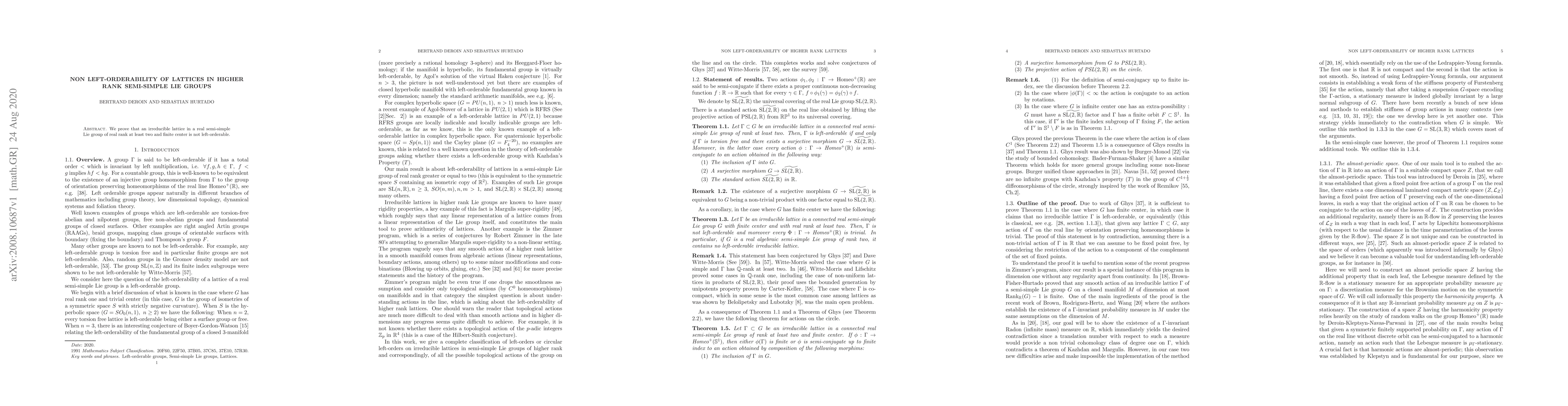 Summary: This paper demonstrates that irreducible lattices in real semi-simple Lie groups of rank at least two and finite center cannot be left-orderable. The result extends the understanding of the orderability properties of such mathematical structures.