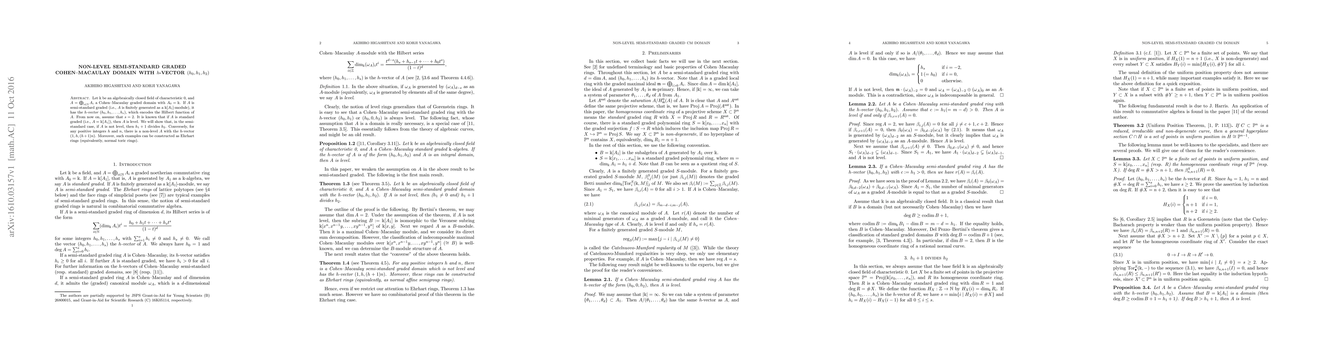 Let $k$ be an algebraically closed field of characteristic 0, and $A$ a Cohen-Macaulay graded domain with $A_0=k$. If $A$ is semi-standard graded (i.e., $A$ is finitely generated as a $k[A_1]$-module), it has the $h$-vector $(h_0, h_1, ..., h_s)$, which encodes the Hilbert function of $A$. From now on, assume that $s=2$. It is known that if $A$ is standard graded (i.e., $A=k[A_1]$), then $A$ is level. We will show that, in the semi-standard case, if $A$ is not level, then $h_1+1$ divides $h_2$. Conversely, for any positive integers $h$ and $n$, there is a non-level $A$ with the $h$-vector $(1, h, (h+1)n)$. Moreover, such examples can be constructed as Ehrhart rings (equivalently, normal toric rings).
