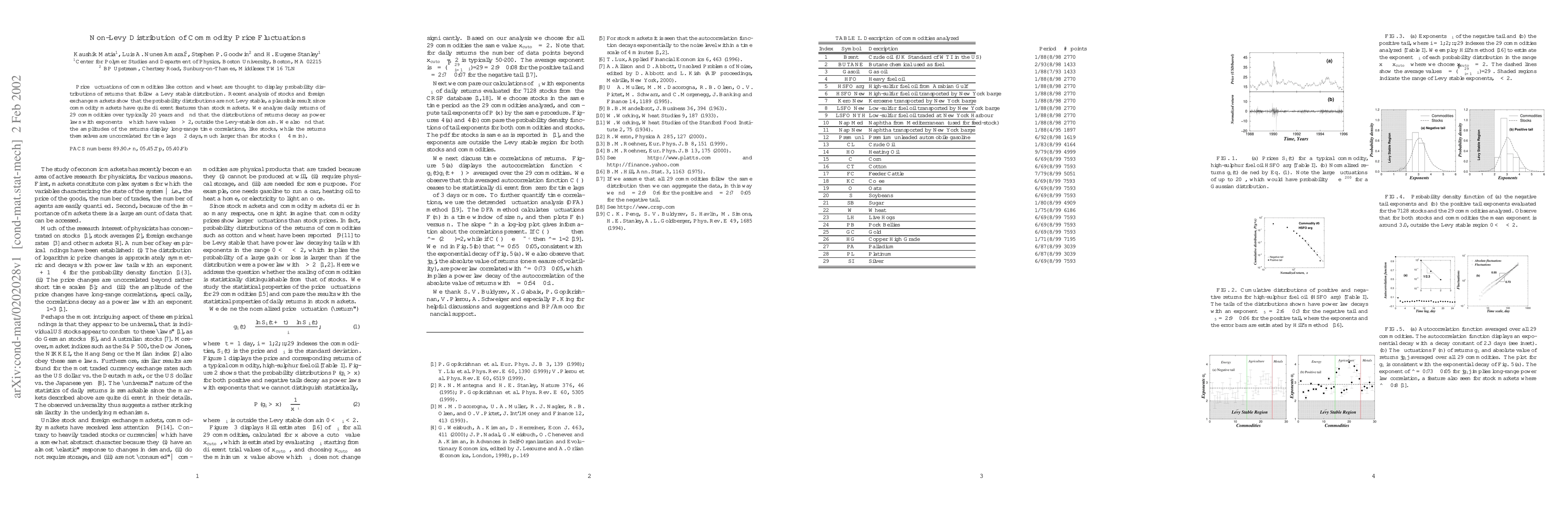 Commodity price fluctuations do not follow Lévy stable distributions as previously thought, but instead decay with power laws outside the stable domain. The paper finds long-range time correlations in amplitudes of returns.