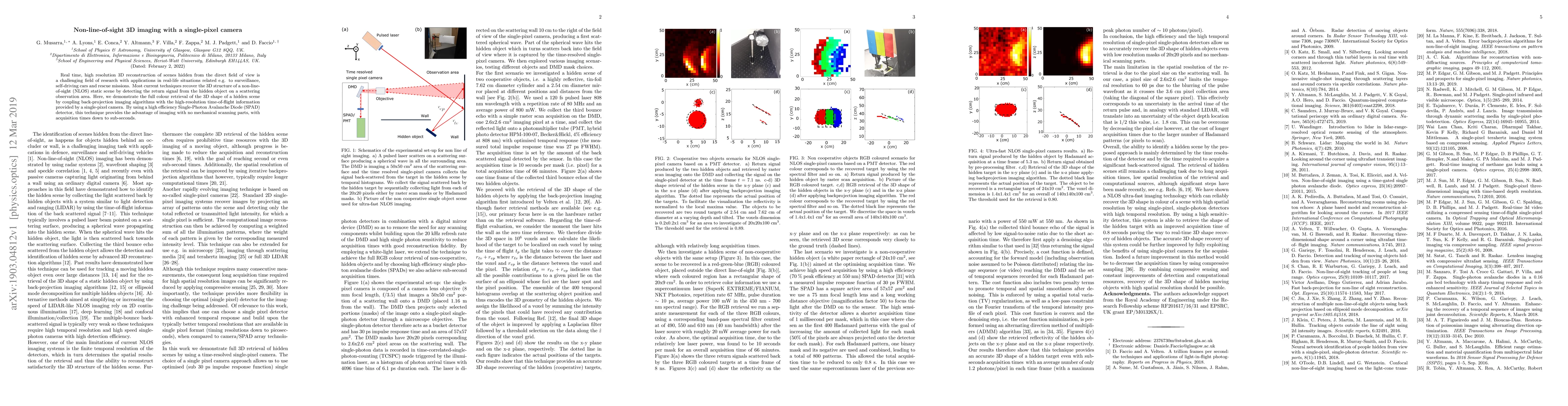Real time, high resolution 3D reconstruction of scenes hidden from the direct field of view is a challenging field of research with applications in real-life situations related e.g. to surveillance, self-driving cars and rescue missions. Most current techniques recover the 3D structure of a non-lineof-sight (NLOS) static scene by detecting the return signal from the hidden object on a scattering observation area. Here, we demonstrate the full colour retrieval of the 3D shape of a hidden scene by coupling back-projection imaging algorithms with the high-resolution time-of-flight information provided by a single-pixel camera. By using a high effciency Single-Photon Avalanche Diode (SPAD) detector, this technique provides the advantage of imaging with no mechanical scanning parts, with acquisition times down to sub-seconds.