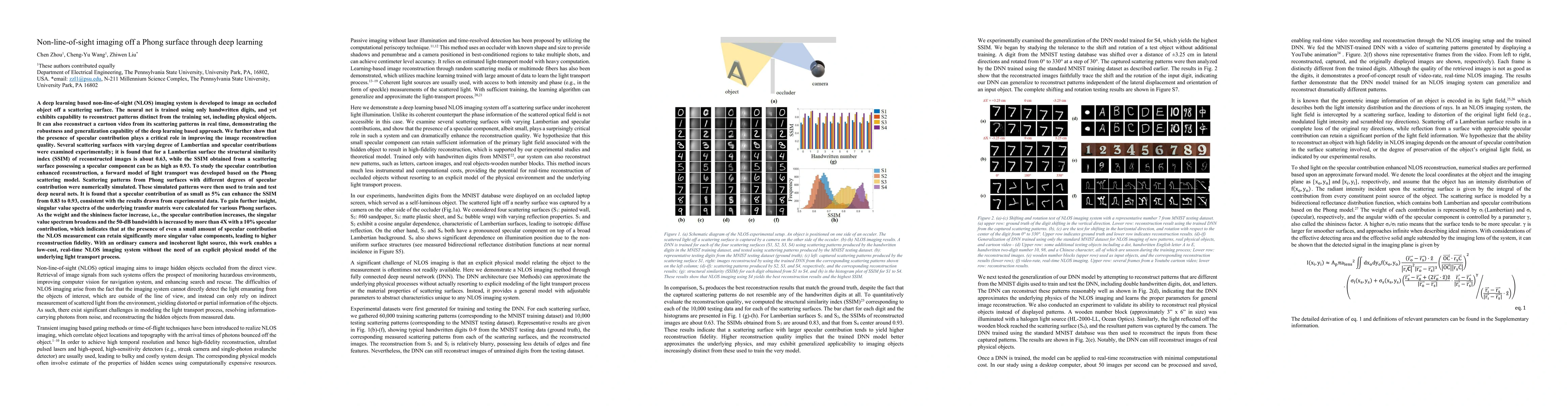 A deep learning based non-line-of-sight (NLOS) imaging system is developed to image an occluded object off a scattering surface. The neural net is trained using only handwritten digits, and yet exhibits capability to reconstruct patterns distinct from the training set, including physical objects. It can also reconstruct a cartoon video from its scattering patterns in real time, demonstrating the robustness and generalization capability of the deep learning based approach. Several scattering surfaces with varying degree of Lambertian and specular contributions were examined experimentally; it is found that for a Lambertian surface the structural similarity index (SSIM) of reconstructed images is about 0.63, while the SSIM obtained from a scattering surface possessing a specular component can be as high as 0.93. A forward model of light transport was developed based on the Phong scattering model. Scattering patterns from Phong surfaces with different degrees of specular contribution were numerically simulated. It is found that a specular contribution of as small as 5% can enhance the SSIM from 0.83 to 0.93, consistent with the results from experimental data. Singular value spectra of the underlying transfer matrix were calculated for various Phong surfaces. As the weight and the shininess factor increase, i.e., the specular contribution increases, the singular value spectrum broadens and the 50-dB bandwidth is increased by more than 4X with a 10% specular contribution, which indicates that at the presence of even a small amount of specular contribution the NLOS measurement can retain significantly more singular value components, leading to higher reconstruction fidelity. With an ordinary camera and incoherent light source, this work enables a low-cost, real-time NLOS imaging system without the need of an explicit physical model of the underlying light transport process.