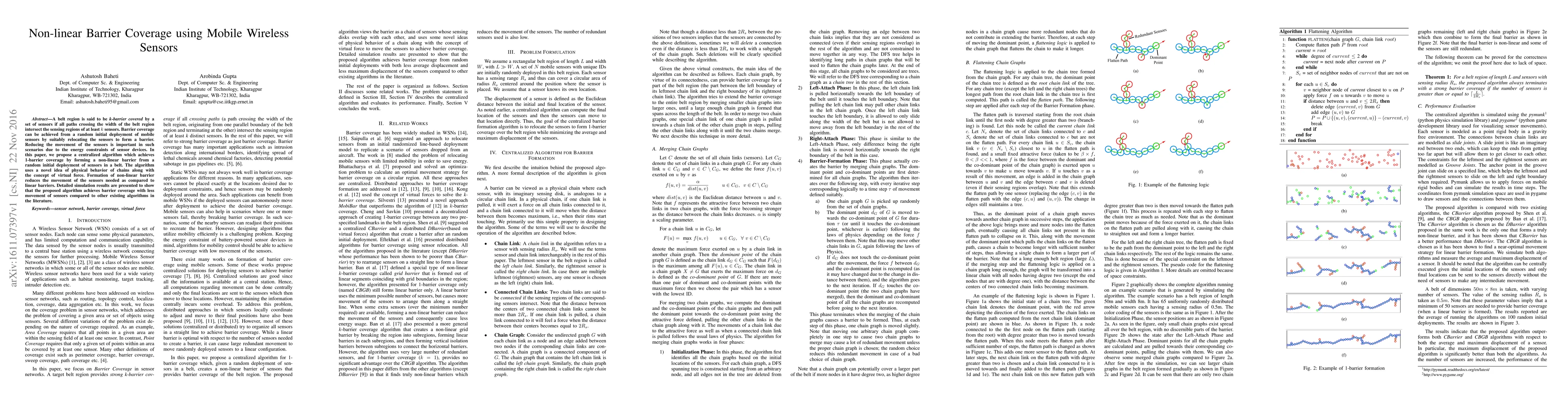This paper proposes a centralized algorithm for achieving 1-barrier coverage using mobile wireless sensors in a belt region by forming a non-linear barrier. The algorithm minimizes sensor movement through the concept of virtual force and physical behavior of chains, demonstrating superior performance in simulations compared to existing linear barrier methods.