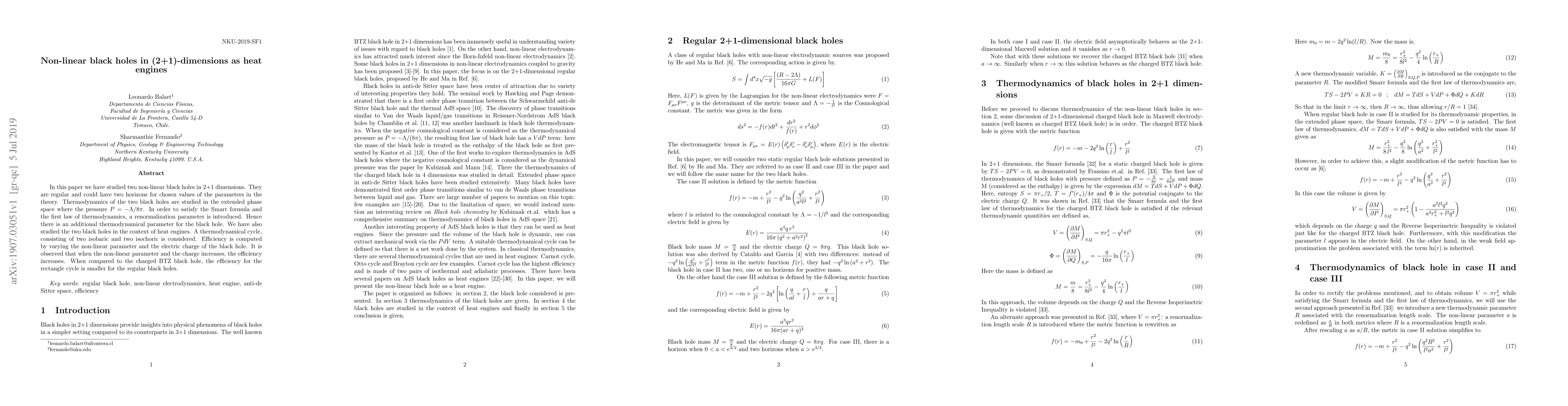 In this paper we have studied two non-linear black holes in 2+1 dimensions. They are regular and could have two horizons for chosen values of the parameters in the theory. Thermodynamics of the two black holes are studied in the extended phase space where the pressure P = -{\Lambda}/8{\pi}. In order to satisfy the Smarr formula and the first law of thermodynamics, a renormalization parameter is introduced. Hence there is an additional thermodynamical parameter for the black hole. We have also studied the two black holes in the context of heat engines. A thermodynamical cycle, consisting of two isobaric and two isochoric is considered. Efficiency is computed by varying the non-linear parameter and the electric charge of the black hole. It is observed that when the non-linear parameter and the charge increases, the efficiency increases. When compared to the charged BTZ black hole, the efficiency for the rectangle cycle is smaller for the regular black holes.