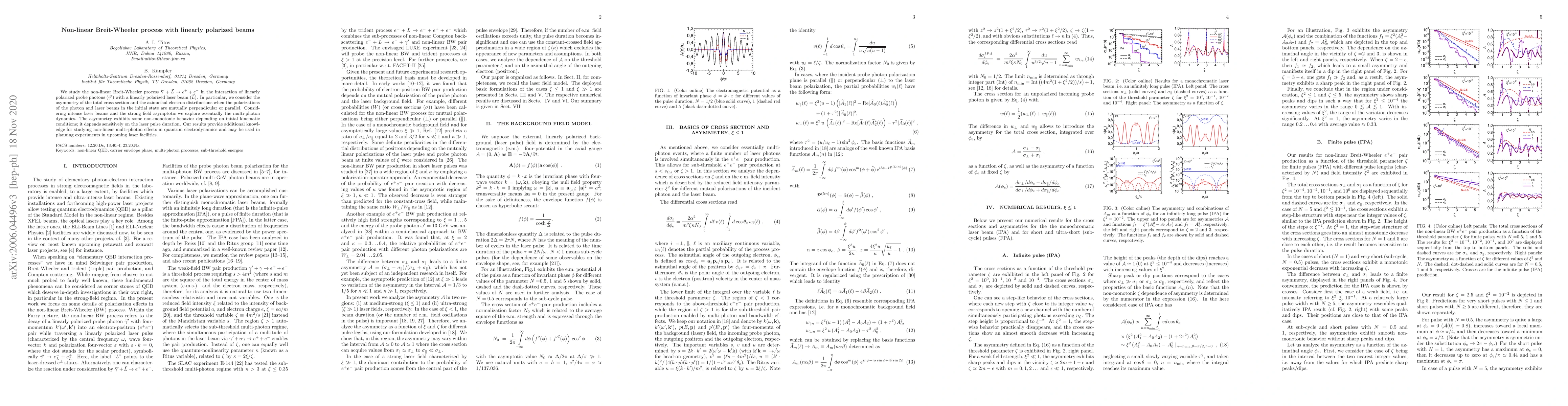 This paper investigates the non-linear Breit-Wheeler process with linearly polarized photons and laser beams, analyzing the asymmetry in the total cross section and electron distributions based on the polarization alignment. The study reveals non-monotonic asymmetry behavior influenced by initial kinematic conditions and laser pulse duration, contributing to understanding non-linear multi-photon effects in quantum electrodynamics.