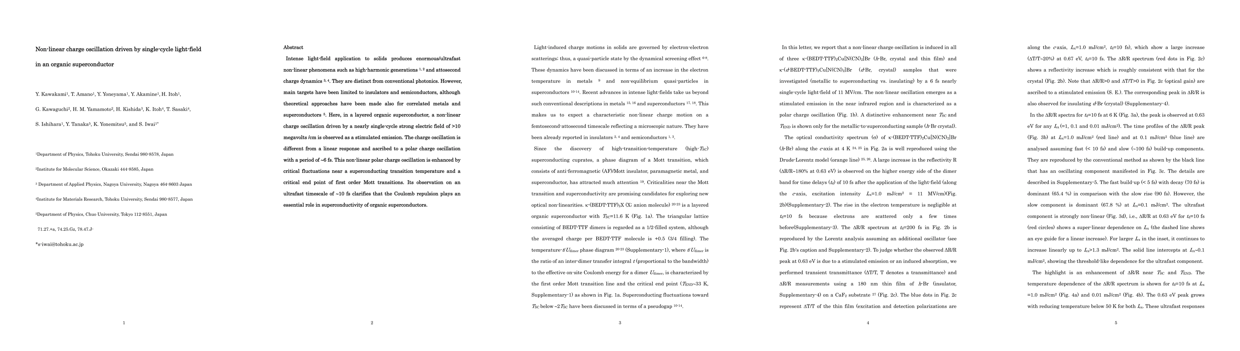 Intense light-field application to solids produces enormous/ultrafast non-linear phenomena such as high-harmonic generations 1, 2 and attosecond charge dynamics 3, 4. They are distinct from conventional photonics. However, main targets have been limited to insulators and semiconductors, although theoretical approaches have been made also for correlated metals and superconductors 5. Here, in a layered organic superconductor, a non-linear charge oscillation driven by a nearly single-cycle strong electric field of >10 megavolts /cm is observed as a stimulated emission. The charge oscillation is different from a linear response and ascribed to a polar charge oscillation with a period of 6 fs. This non-linear polar charge oscillation is enhanced by critical fluctuations near a superconducting transition temperature and a critical end point of first order Mott transitions. Its observation on an ultrafast timescale of 10 fs clarifies that the Coulomb repulsion plays an essential role in superconductivity of organic superconductors.